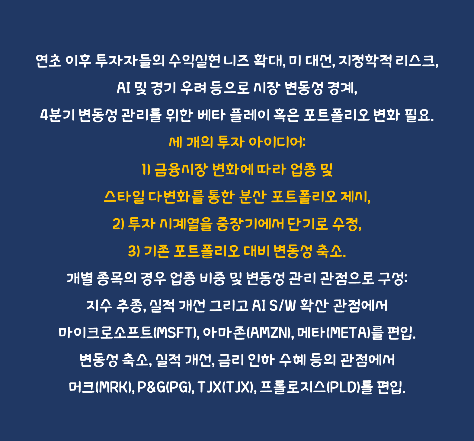ETF의 경우 베타 플레이를 위한 지수 추종 투자: 스타일 관점에서 경제적해자(MOAT), 고배당(SCHD), 퀄리티(QUAL)를, 업종 관점에서는 변동성 축소, 금리 인하 수혜, 실적 개선 등을 반영해 필수소비재(XLP), 헬스케어(XLV), 방위산업(PPA)을 편입.