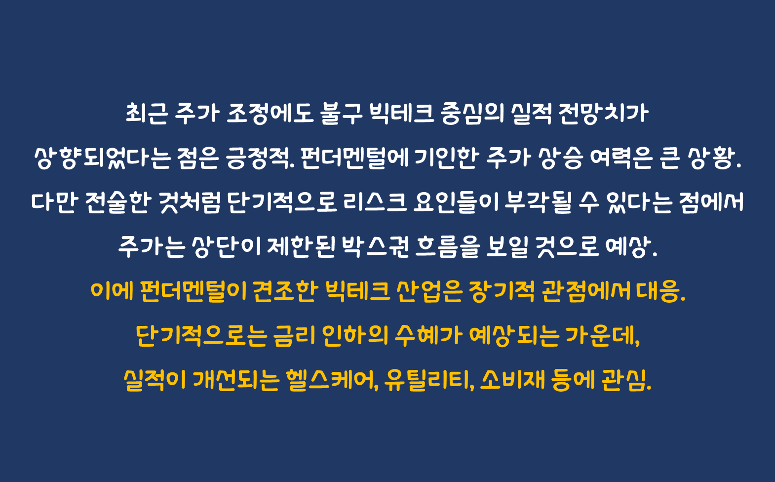 최근 주가 조정에도 불구 빅테크 중심의 실적 전망치가 상향되었다는 점은 긍정적. 펀더멘털에 기인한 주가 상승 여력은 큰 상황. 다만 전술한 것처럼 단기적으로 리스크 요인들이 부각될 수 있다는 점에서 주가는 상단이 제한된 박스권 흐름을 보일 것으로 예상. 이에 펀더멘털이 견조한 빅테크 산업은 장기적 관점에서 대응. 단기적으로는 금리 인하의 수혜가 예상되는 가운데, 실적이 개선되는 헬스케어, 유틸리티, 소비재 등에 관심.