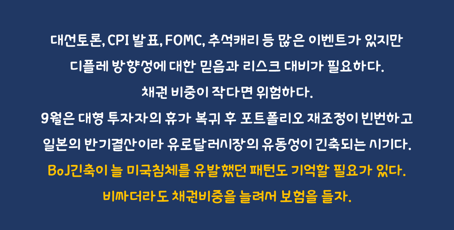 이벤트가 많은 주간 채권비중이 작다면 리스크가 크다: 대선토론, CPI 발표, FOMC, 추석캐리 등 많은 이벤트가 있지만 디플레 방향성에 대한 믿음과 리스크 대비가 필요하다. 채권 비중이 작다면 위험하다. 참고로 우리는 세간의 인식과 반대로 트럼프를 상대적 디플레, 해리스를 인플레로 본다. 9월은 대형 투자자의 휴가 복귀 후 포트폴리오 재조정이 빈번하고 일본의 반기결산이라 유로달러시장의 유동성이 긴축되는 시기다. BoJ긴축이 늘 미국침체를 유발했던 패턴도 기억할 필요가 있다. 비싸더라도 채권비중을 늘려서 보험을 들자.