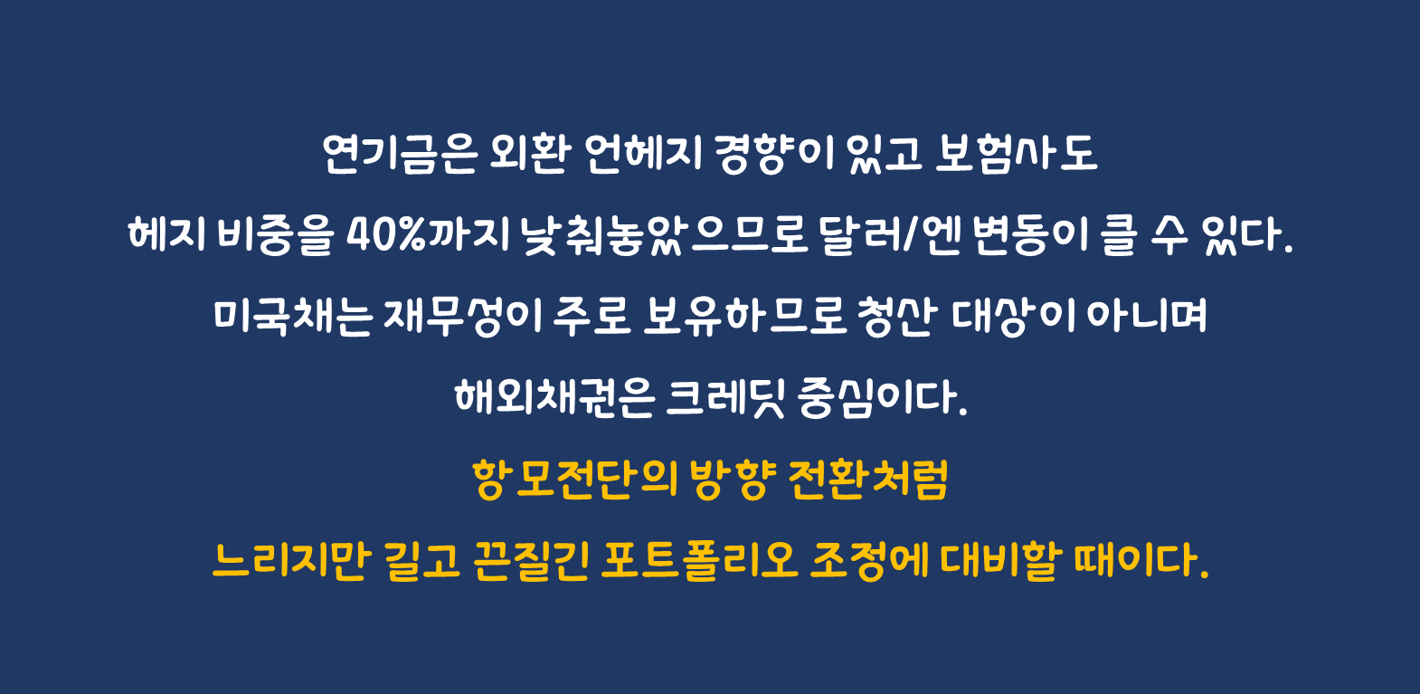 달러/엔 환율과 USD/JPY XCCY에 엔캐리 청산 조짐 보수적 가정 시 2~4조 달러: 일본 투자자의 본격적인 해외투자 청산 움직임은 10월에 주요 금융기관의 반기보고서가 나와야 알 수 있다. 언론에 포지션 전환을 흘리는 바보짓을 기대하기는 어렵다. 따라서 간접적으로 느껴보자. 달러 대비 엔의 가치는 8월 초의 엔숏페어트레이드의 청산 당시보다 더 강해졌대. 달러/엔의 다양한 기술적 지표를 보면 5년 가까이 진행된 추세가 전 환점을 맞이했다. 해외 자산을 바로 매각하면 시장에 충격이 커지며 자충수가 될 수 있다. 따라서 최선의 대처는 USD/JPY 선물환 매도를 통한 환해지다. 해당 움직임을 보여주는 달러/엔 베이시스스왑(XCCY)은 최근 수개월간 하락하면서 환지 수요가 몰리고 있음을 암시했다. 엔캐리 규모는 상황에 따라서 다르게 측정해야 한다. 지금은 일본 금융기관의 해외대출을 볼 때가 아니다. 대신 일본 연기금, 보험사, 은행들의 2011년 아베노믹스 개시 이후의 늘어난 해외투자 전체가 잠재적인 청산 규모라고 봐야 한다. 정부산하 연기금으로서 타 투자기관의 모범으로 참고할만한 GPF는 2011년 이후 주로 해외주식과 채권, 일본 주식을 편입했다. 보험사나 민간연금도 크게 다르지 않을 것이다. 이들이 2011년 이전의 해외투자 증가 추세선까지 회귀해 간다고 했을 때 청산 가능한 엔캐리 규모는 2~4조 달러로 추정된다. 이는 2011년 이후 증가분의 전체 청산이 아닌 99~2010년까지의 완만한 해외투자 비중 증가 추세를 가정한 채 이를 넘어선 부분만 산정한 것이므로 보수적 가정이다. 연기금은 외환 언헤지 경향이 있고 보험사도 헤지 비중을 40%까지 낮춰놓았으므로 달러/엔 변동이 클 수 있다. 미국채는 재무성이 주로 보유하므로 청산 대상이 아니며 해외채권은 크레딧 중심이다. 항모전단의 방향 전환처럼 느리지만 길고 끈질긴 포트폴리오 조정에 대비할 때이다.