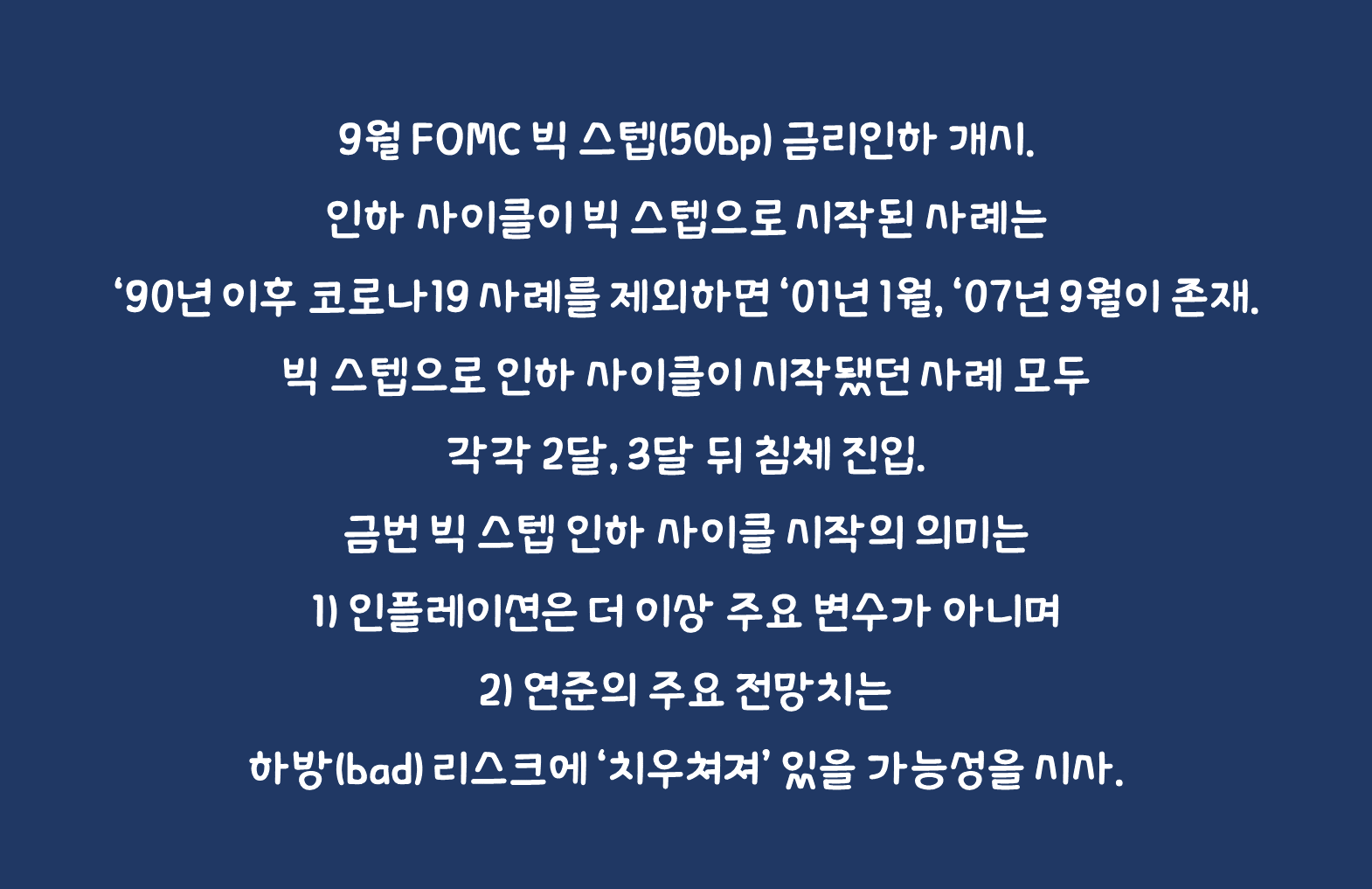 9월 FOMC 빅 스텝(50bp) 금리인하 개시. 인하 사이클이 빅 스텝으로 시작된 사례는 ‘90년 이후 코로나19 사례를 제외하면 ‘01년 1월, ‘07년 9월이 존재. 빅 스텝으로 인하 사이클이 시작됐던 사례 모두 각각 2달, 3달 뒤 침체 진입. 이를 감안해 기자회견에서 파월은 지속적으로 미국 경제가 여전히 좋은 상태임을 강조.