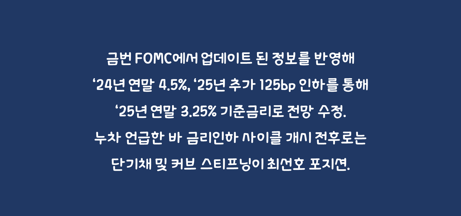 빅 스텝(50bp) 인하로 금리인하 시작. 경기 전망에 대한 ‘리스크 비대칭성’ 감안하면 ‘24년 추가 50bp 인하, ‘25년 125bp 금리인하를 통해 ‘25년 연말 기준금리 3.25%로 전망 수정. 여전히 단기채 및 커브 스티프닝이 최선호 포지션.