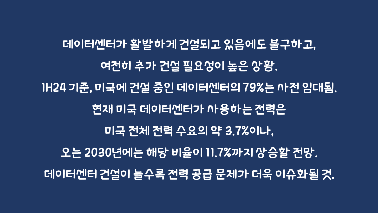 데이터센터가 활발하게 건설되고 있음에도 불구하고, 여전히 추가 건설 필요성이 높은 상황. 1H24 기준, 미국에 건설 중인 데이터센터의 79%는 사전 임대됨. 현재 미국 데이터센터가 사용하는 전력은 미국 전체 전력 수요의 약 3.7%이나, 오는 2030년에는 해당 비율이 11.7%까지 상승할 전망. 데이터센터 건설이 늘수록 전력 공급 문제가 더욱 이슈화될 것. 현재 데이터센터의 빠른 보급을 저해하는 요인 중 하나는 청정 에너지로 생산한 전력을 원활하게 조달하기 어렵다는 점. 발전원 투자 외에도 새로운 발전원의 빠른 보급을 유도할 수 있는 전력망 투자가 동반되어야 하며 전력 인프라 Value Chain 전반의 우수한 성과가 이어질 전망.