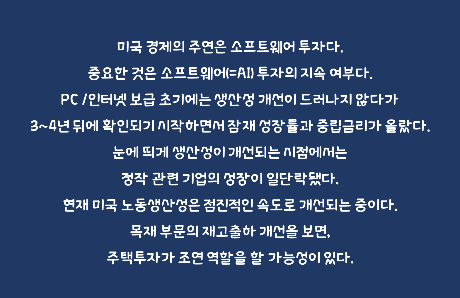 미국 경제의 주연은 소프트웨어 투자다. 조연은 2020년 내구재 소비, 2021년 서비스 소비, 2023년 공장투자로 변해 왔다. 중요한 것은 소프트웨어(=AI) 투자의 지속 여부다. PC /인터넷 보급 초기에는 생산성 개선이 드러나지 않다가 3~4년 뒤에 확인되기 시작하면서 잠재 성장률과 중립금리가 올랐다. 눈에 띄게 생산성이 개선되는 시점에서는 정작 관련 기업의 성장이 일단락됐다. 현재 미국 노동생산성은 점진적인 속도로 개선되는 중이다.