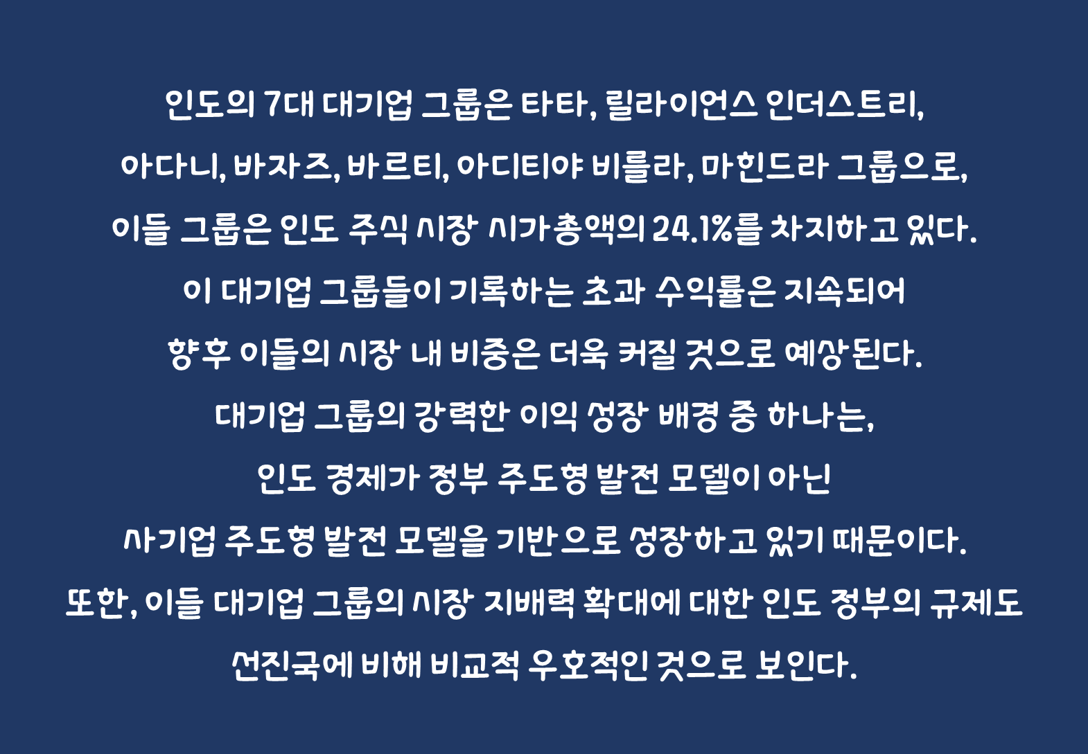 인도의 7대 대기업 그룹은 타타, 릴라이언스 인더스트리, 아다니, 바자즈, 바르티, 아디티야 비를라, 마힌드라 그룹으로, 이들 그룹은 인도 주식 시장 시가총액의 24.1%를 차지하고 있다. 이 대기업 그룹들이 기록하는 초과 수익률은 지속되어 향후 이들의 시장 내 비중은 더욱 커질 것으로 예상된다.