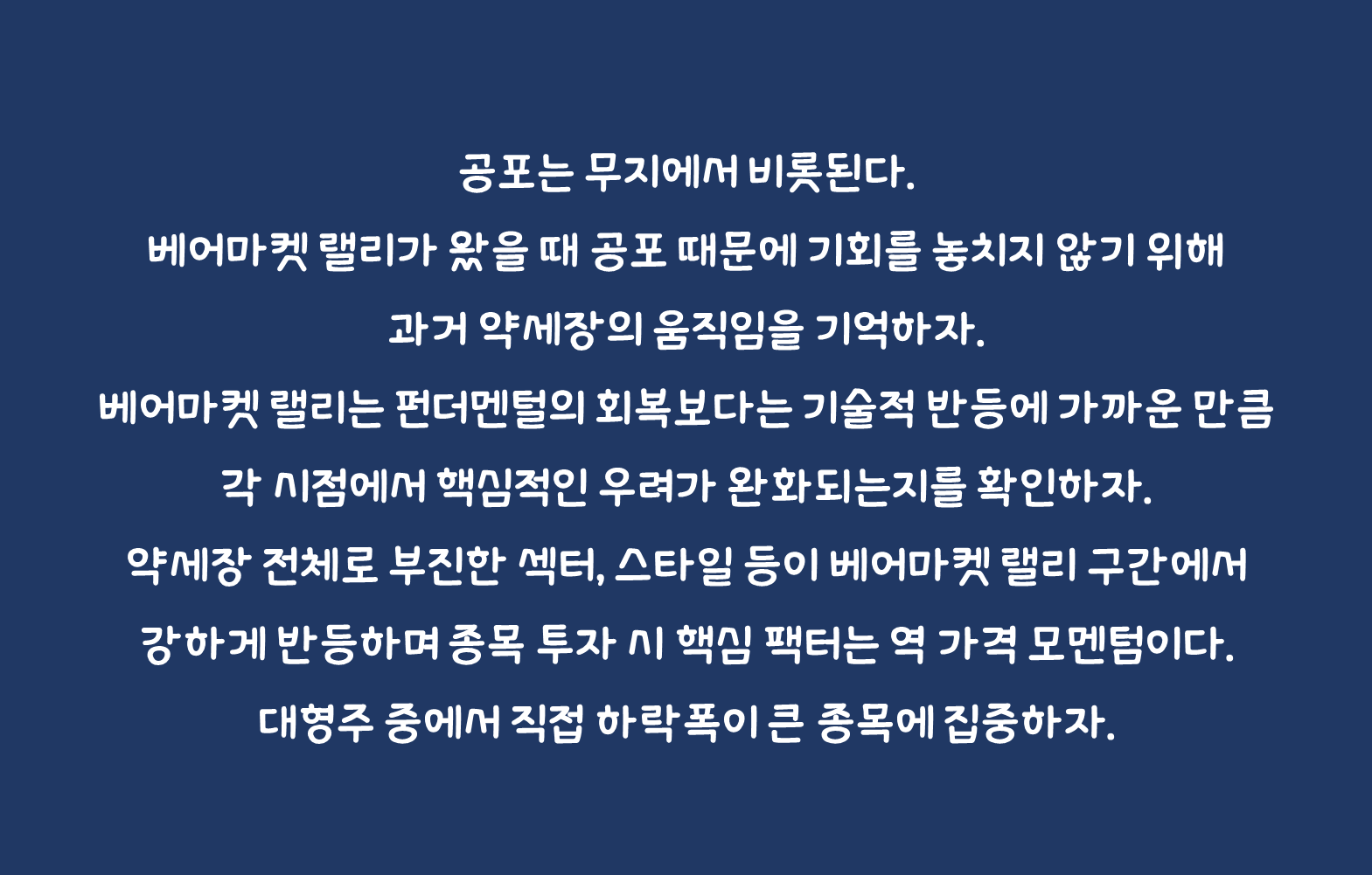 공포는 무지에서 비롯된다. 베어마켓 랠리가 왔을 때 공포 때문에 기회를 놓치지 않기 위해 과거 약세장의 움직임을 기억하자. 대세 약세장이 시작되기 직전의 KOSPI 레벨을 회복하기까지 짧게는 2.8년에서 길게는 10.7년에 걸렸으나 중간에 베어마켓 랠리 없이 1년 이상 약세장이 이어진 경우는 단 한 번도 없었다. 베어마켓 랠리는 펀더멘털의 회복보다는 기술적 반등에 가까운 만큼 각 시점에서 핵심적인 우려가 완화되는지를 확인하자. 약세장 전체로 부진한 섹터, 스타일 등이 베어마켓 랠리 구간에서 강하게 반등하며 종목 투자 시 핵심 팩터는 역 가격 모멘텀이다. 대형주 중에서 직접 하락폭이 큰 종목에 집중하자. 매크로, 기술, 수급 데이터를 활용하여 베어마켓 랠리 구간에 대한 예측력을 높이자.