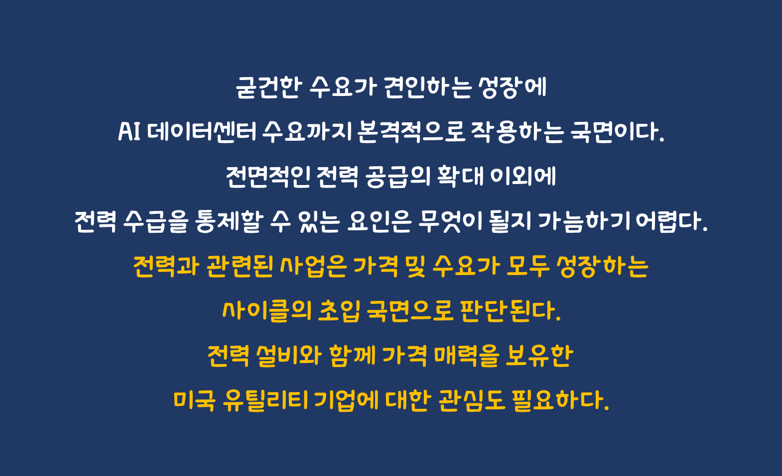 미국의 2024년 전력 수요의 사례는 전력가격 및 경기 사이클이 전력 수요의 성장을 억제하지 못한다는 점을 증명해주고 있다. 굳건한 수요가 견인하는 성장에 AI 데이터센터 수요까지 본격적으로 작용하는 국면이다. 전면적인 전력 공급의 확대 이외에 전력 수급을 통제할 수 있는 요인은 무엇이 될지 가늠하기 어렵다. 전력과 관련된 사업은 가격 및 수요가 모두 성장하는 사이클의 초입 국면으로 판단된다. 전력 설비와 함께 가격 매력을 보유한 미국 유틸리티 기업에 대한 관심도 필요하다.