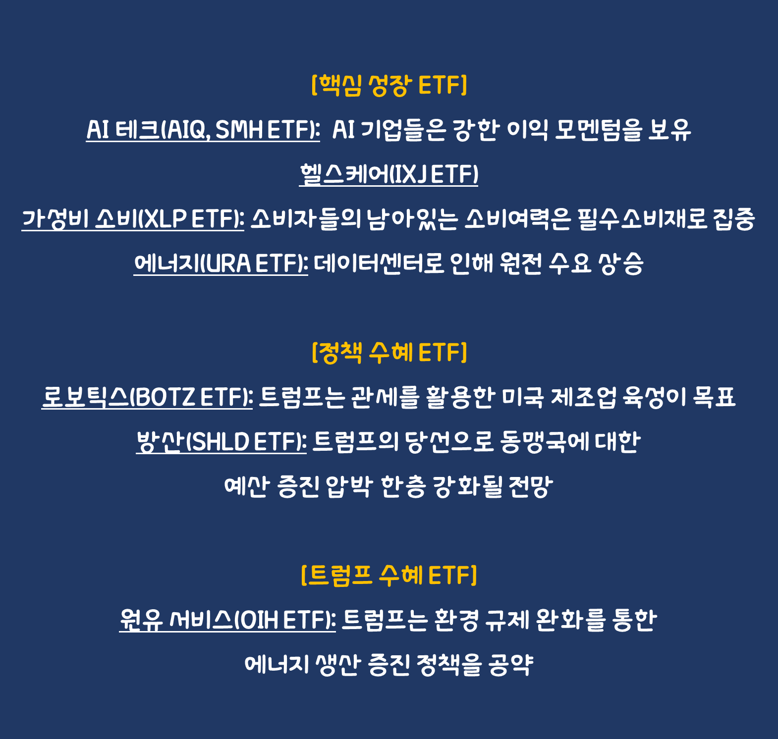 - 로보틱스(BOTZ ETF): 트럼프는 관세를 활용한 미국 제조업 육성이 목표. 제조업 시설에는 산업용 로봇이 필수적. AI도 접목
