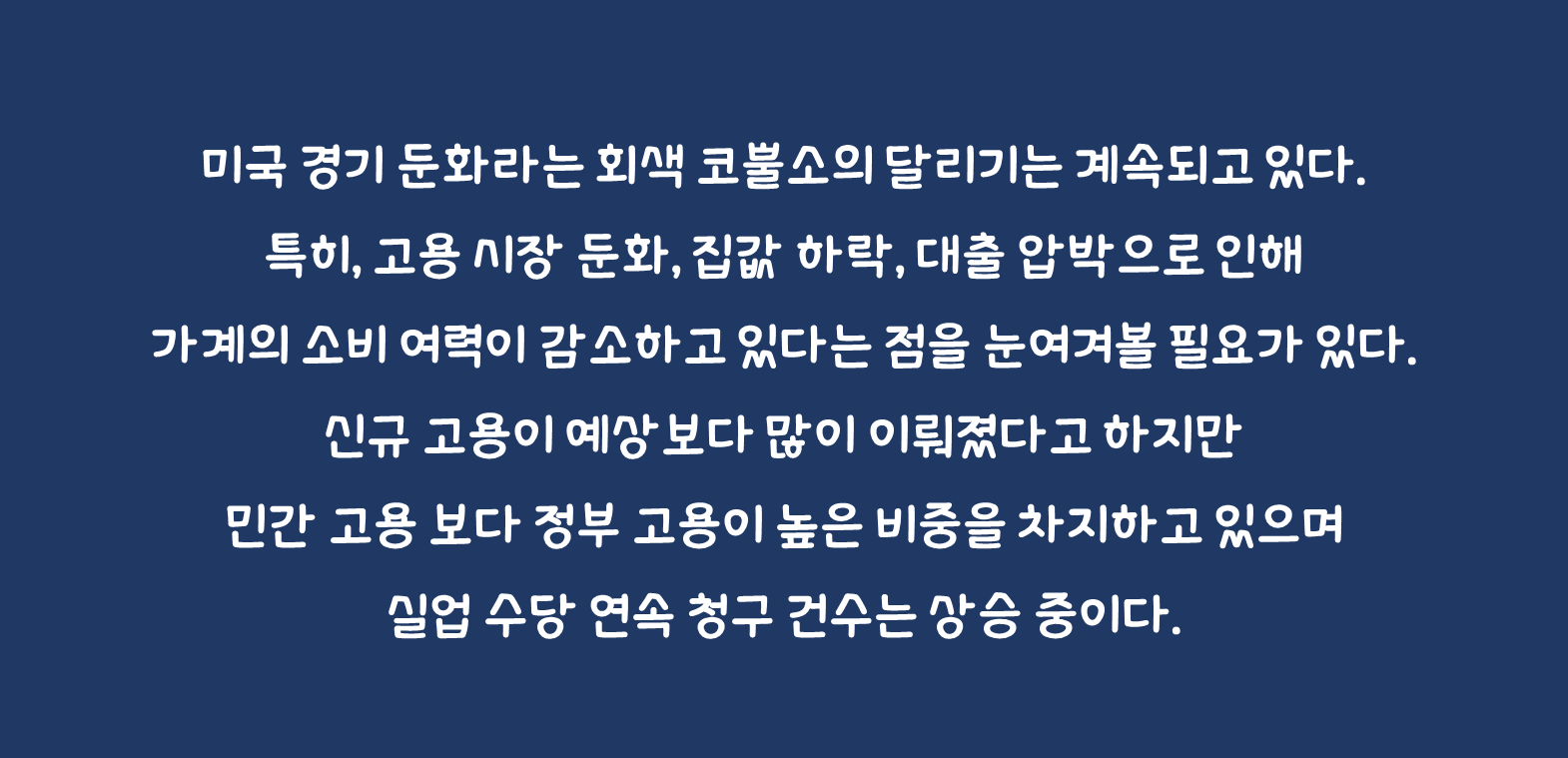 미국 경기 둔화라는 회색 코뿔소의 달리기는 계속되고 있다. 특히, 고용 시장 둔화, 집값 하락, 대출 압박으로 인해 가계의 소비 여력이 감소하고 있다는 점을 눈여겨볼 필요가 있다. 신규 고용이 예상보다 많이 이뤄졌다고 하지만 민간 고용 보다 정부 고용이 높은 비중을 차지하고 있으며 실업 수당 연속 청구 건수는 상승 중이다. 미국 주택 판매가격 하락은 수요 둔화 및 공급 증가로 지속될 것으로 판단한다. 마지막으로 고금리, 학자금 대출 상환 개시로 미국 가계가 느끼는 대출 압박이 커지고 있다.