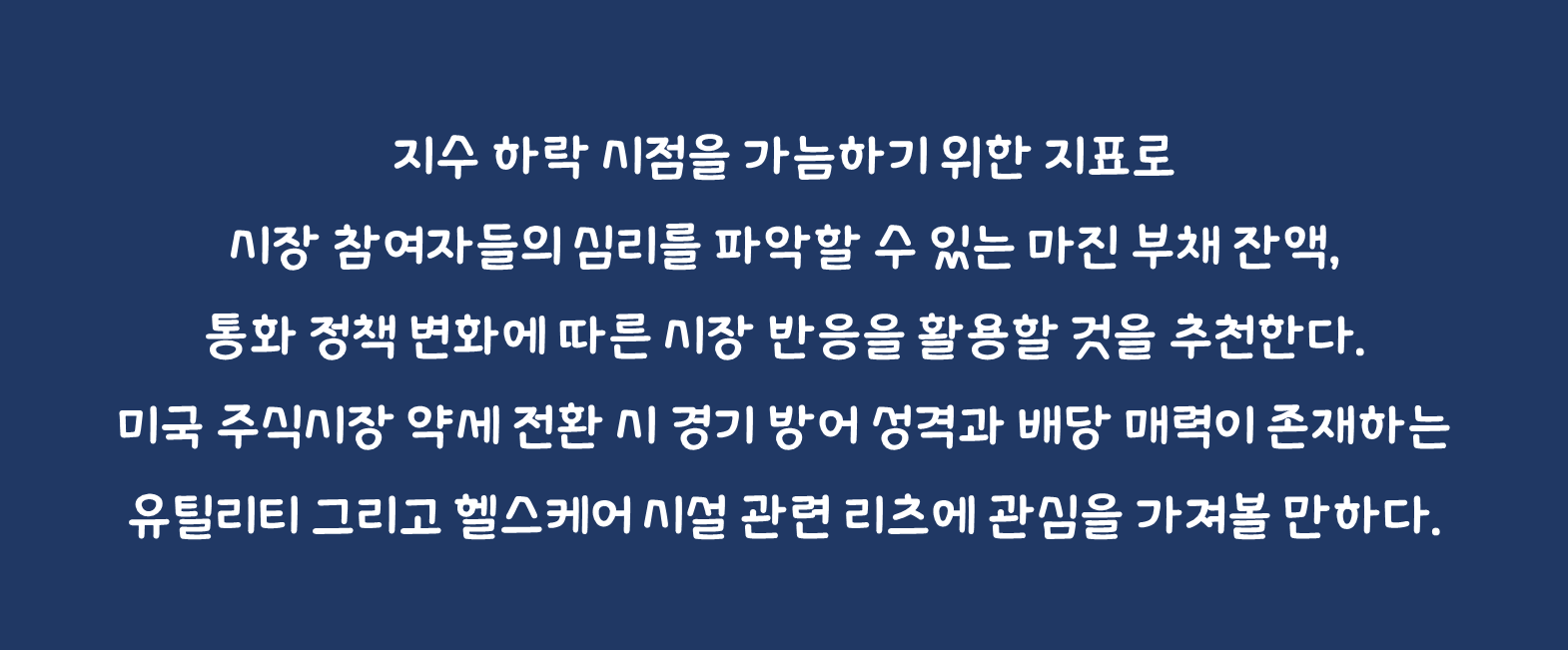 2025년 예상 S&P500 밴드를 4,200~6,400으로 제시한다. 기술주 고평가와 경기 둔화 우려가 공존했던 지난 2000년 당시 PBR 및 PER을 적용하였다. 지수 하락 시점을 가늠하기 위한 지표로 시장 참여자들의 심리를 파악할 수 있는 마진 부채 잔액, 통화 정책 변화에 따른 시장 반응을 활용할 것을 추천한다. 미국 주식시장 약세 전환 시 경기 방어 성격과 배당 매력이 존재하는 유틸리티 그리고 헬스케어 시설 관련 리츠에 관심을 가져볼 만하다.