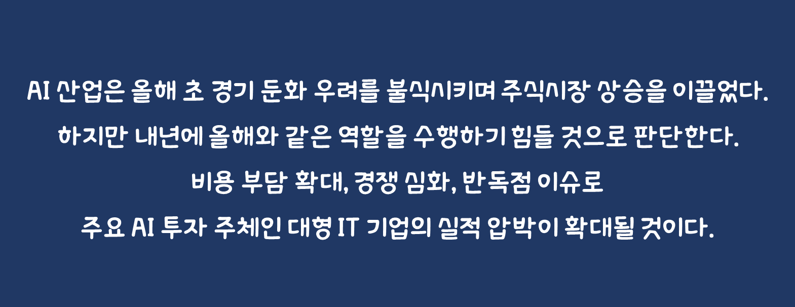 AI 산업은 올해 초 경기 둔화 우려를 불식시키며 주식시장 상승을 이끌었다. 하지만 내년에 올해와 같은 역할을 수행하기 힘들 것으로 판단한다. 비용 부담 확대, 경쟁 심화, 반독점 이슈로 주요 AI 투자 주체인 대형 IT 기업의 실적 압박이 확대될 것이다. 기저효과 소멸로 인한 성장률 증가 둔화, AI 서비스 기업에 확대되는 수익성 확보 요구는 AI 기업 주가에 부정적인 영향을 미칠 가능성이 크다.