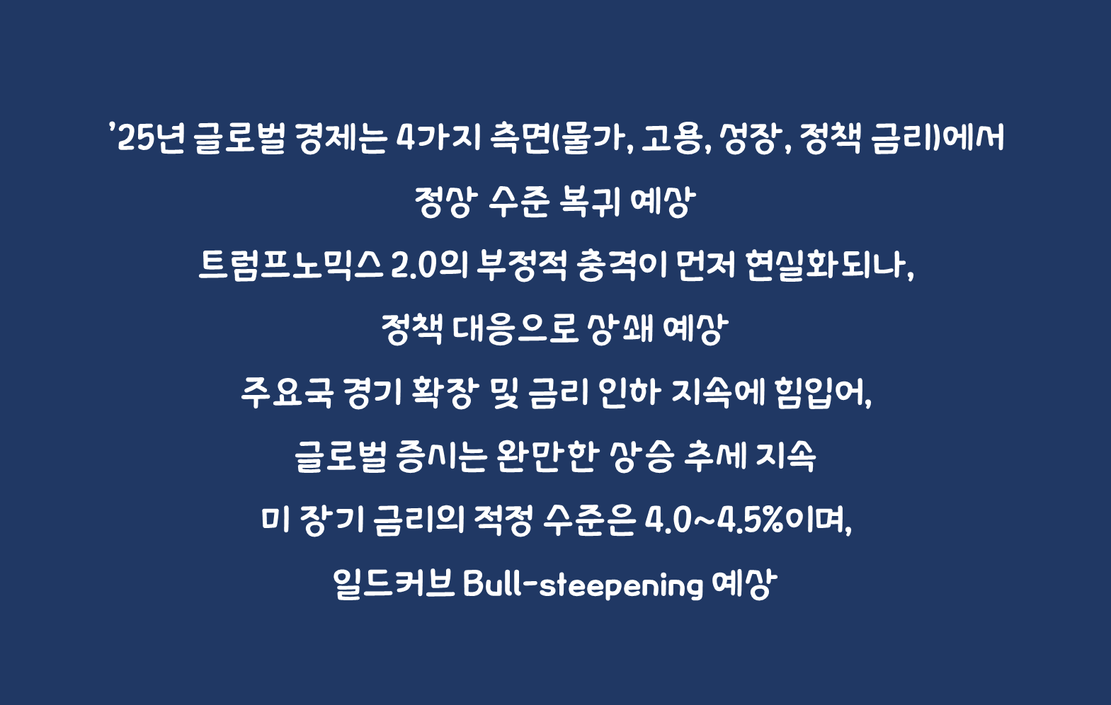 ✅’25년 글로벌 경제는 4가지 측면(물가, 고용, 성장, 정책 금리)에서 정상 수준 복귀 예상. 트럼프노믹스 2.0의 부정적 충격이 먼저 현실화되나, 정책 대응으로 상쇄 예상