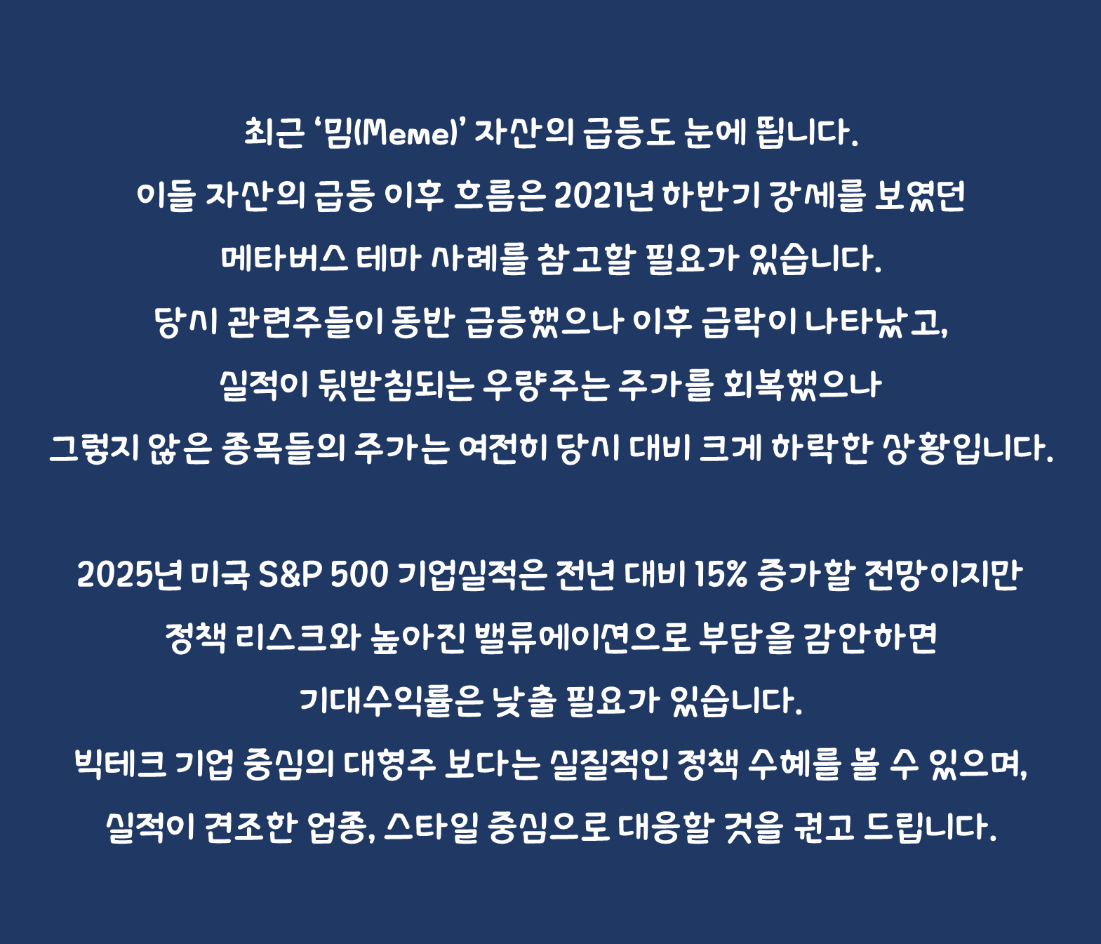 최근 ‘밈(Meme)’ 자산의 급등도 눈에 띕니다. 이들 자산의 급등 이후 흐름은 2021년 하반기 강세를 보였던 메타버스 테마 사례를 참고할 필요가 있습니다. 당시 관련주들이 동반 급등했으나 이후 급락이 나타났고, 실적이 뒷받침되는 우량주는 주가를 회복했으나 그렇지 않은 종목들의 주가는 여전히 당시 대비 크게 하락한 상황입니다.