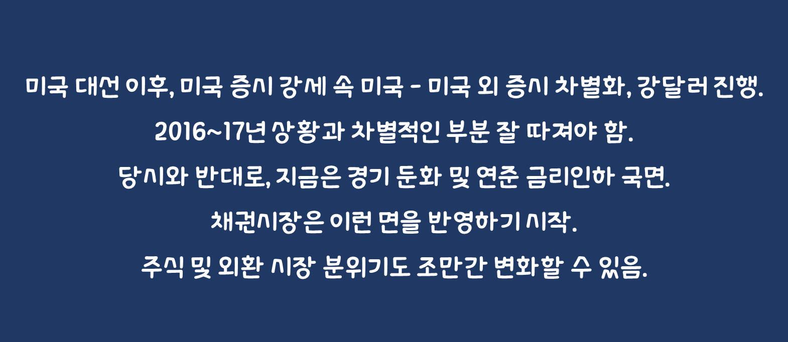 - 미국 대선 이후, 미국 증시 강세 속 미국 - 미국 외 증시 차별화, 강달러 진행.