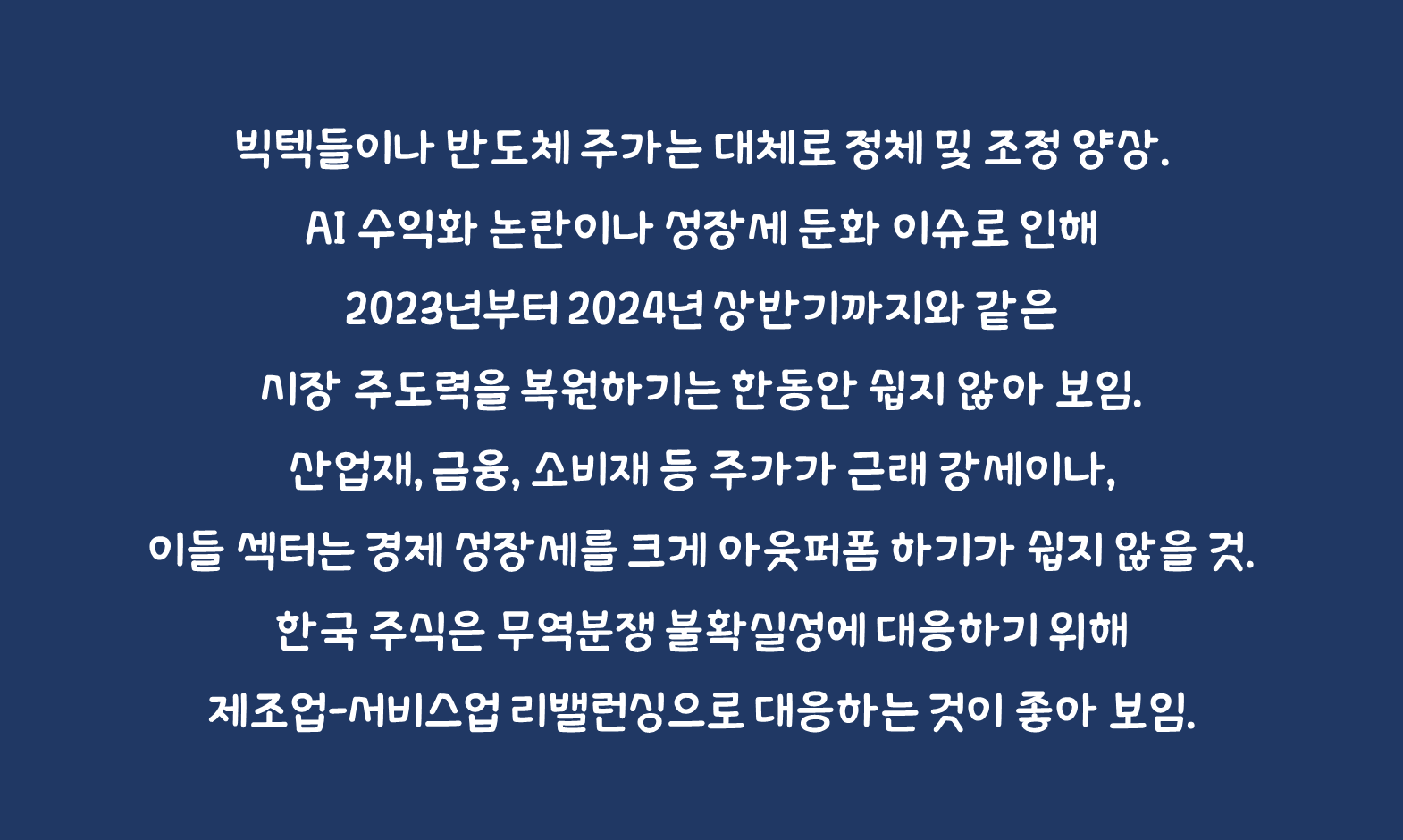 - 즉, 테크 기업들은 잘 골라야 할 상황이 되었고, 미국 증시 전체적인 기대수익률은 지난 2년간에 비해 낮게 설정할 필요가 커졌음 -> 주식에 대해 중립 의견으로 하향(벤치마크 수준으로 보유).
