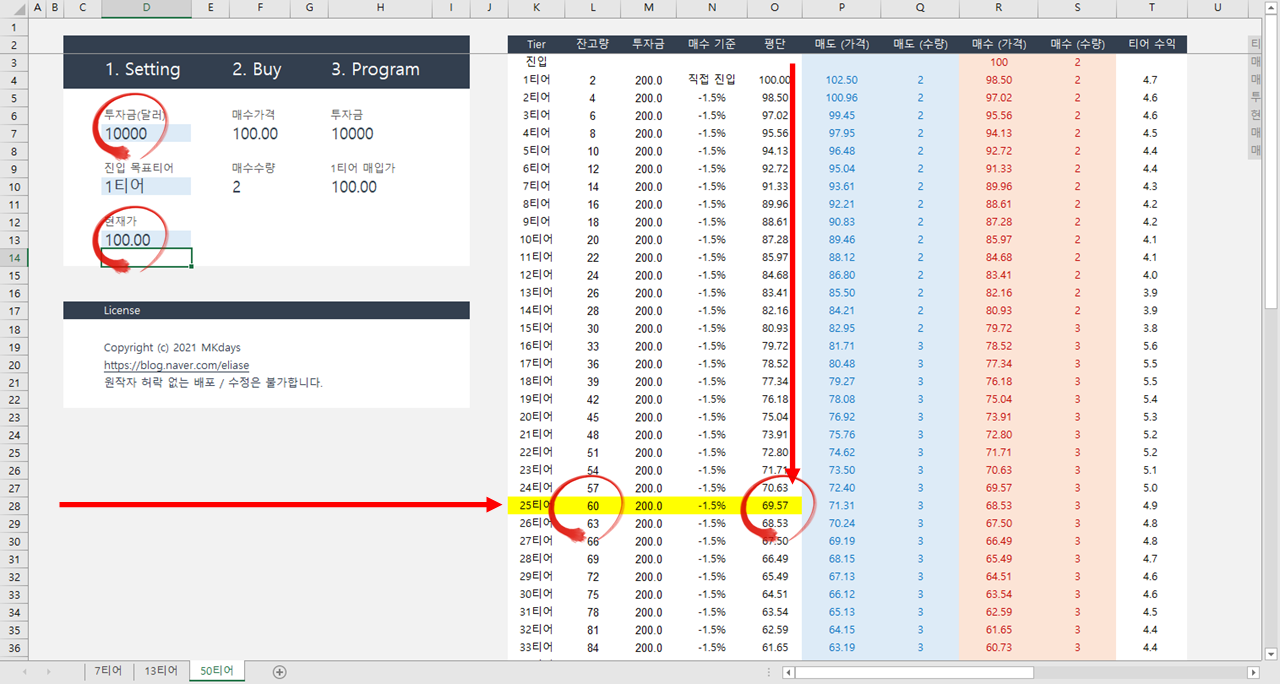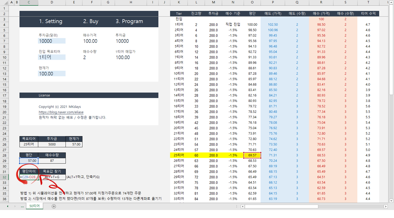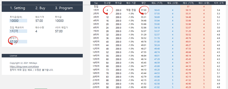 중간 티어 진입을 위한 수량과 단가 맞추기 시작합니다. 먼저 Lotto님의 엑셀을 실행하고 본인의 투자금을 입력하고 현재가는 100.00 USD로 맛보기를 해봅니다. 현재가 100.00 USD로 1 티어 진입했다면 25 티어 까지 내려갔을 때 보유 수량은 60개 평단은 69.57 USD로 자동 계산이 됩니다. 예시로, 현재 TECL의 마켓 단가는 57.00 USD로 평단가의 차이가 발생됩니다.