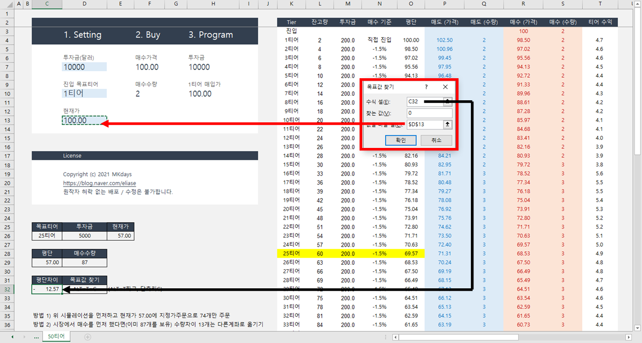 정답: 처음 1 티어의 현재가는 81.91로 진입하면 된다. 엑셀의 목표값 찾기로 찾을 수 있습니다. 처음이라 어려워 보이면 그냥 손으로 몇 번 Trial Run 하다 보면 맞출 수 있습니다.