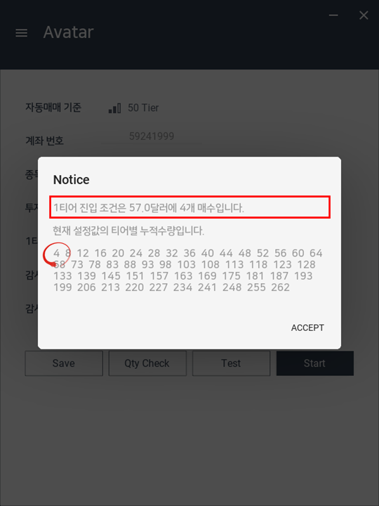 Lotto님 자동매매 프로그램은 계좌 잔고 내 종목의 '수량'을 가지고 현재 위치한 티어를 판단하기 때문에 수량을 맞춰 줘야 합니다. (프로그램이 계속 개선되면서 유사하게 맞추어 줘도 되는 것으로 알고 있어요) 1 티어는 자동을 지원하지 않기 때문에 본인이 직접 매수하여 진입해 주면 됩니다.