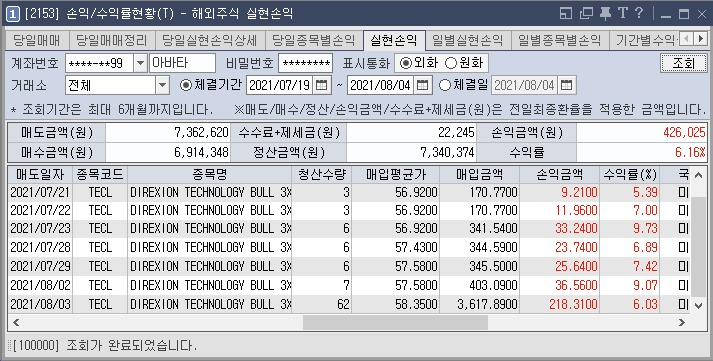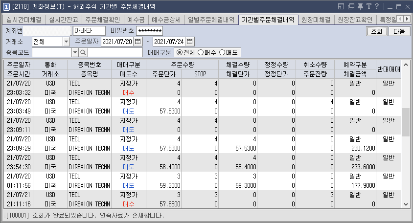 일단 사야 팔 수 있겠죠? 사용하고자 하는 키움 계좌에 예수금을 이체하고 Lotto님 자동매매 프로그램을 실행해 주겠습니다. 종목은 미니 TQQQ라 할 수 있는 TECL로 진입했습니다. 일단 TQQQ는 포텐 아바타 13 티어 법으로 진행하고 있기도 하고 이체한 예수금이 많지 않아 단가가 비싼 TQQQ보다는 비슷한 움직임을 보이는 TECL로 정했습니다.