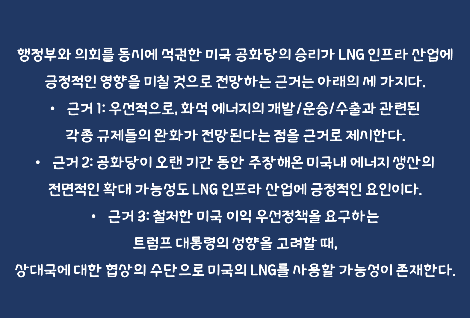 행정부와 의회를 동시에 석권한 미국 공화당의 승리가 LNG 인프라 산업에 긍정적인 영향을 미칠 것으로 전망하는 근거는 아래의 세 가지다.