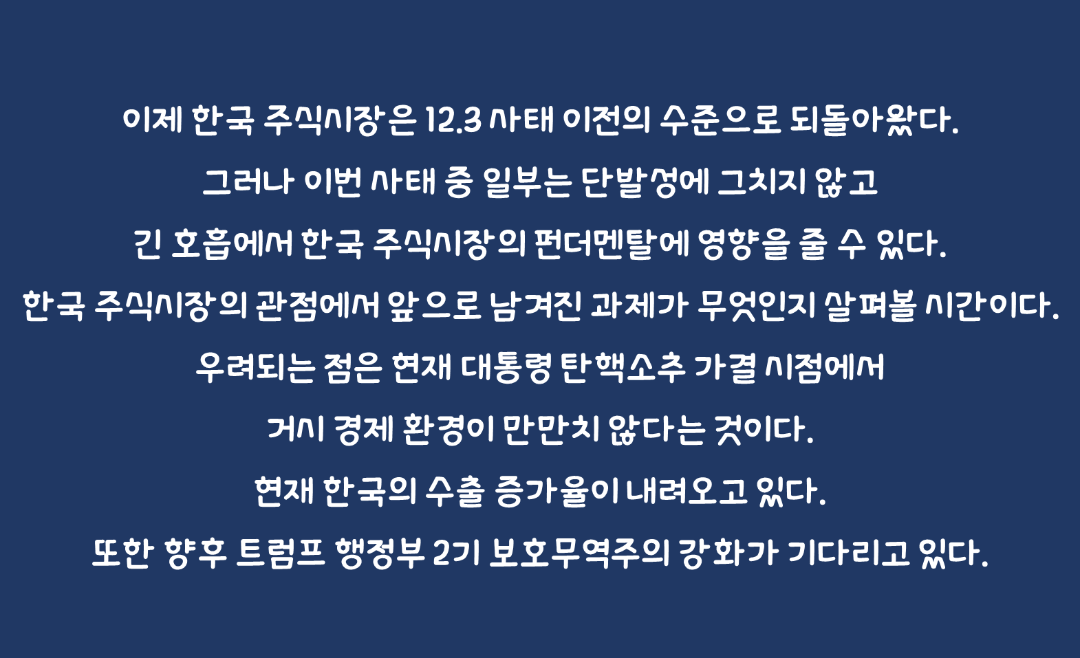 ✓ 우려되는 점은 현재 대통령 탄핵소추 가결 시점에서 거시 경제 환경이 만만치 않다는 것이다. 현재 한국의 수출 증가율이 내려오고 있다. 한국의 수출 증가율은 글로벌 비즈니스 사이클과 밀접하게 연동되며, 필자가 추정한 바로 그것의 하락은 일정 기간 지속될 확률이 높아 보인다. 또한 향후 트럼프 행정부 2기 보호무역주의 강화가 기다리고 있다. 이처럼 중요한 시기에 2025년 상반기 동안은 미국과 교역 협상을 진행해 나갈 한국의 컨트롤 타워가 약화됐다.