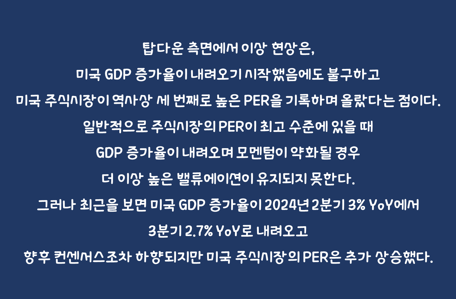 ✓ 탑다운 측면에서 이상 현상은, 미국 GDP 증가율이 내려오기 시작했음에도 불구하고 미국 주식시장이 역사상 세 번째로 높은 PER을 기록하며 올랐다는 점이다. 일반적으로 주식시장의 PER이 최고 수준에 있을 때 GDP 증가율이 내려오며 모멘텀이 약화될 경우 더 이상 높은 밸류에이션이 유지되지 못한다. 그러나 최근을 보면 미국 GDP 증가율이 2024년 2분기 3% YoY에서 3분기 2.7% YoY로 내려오고 향후 컨센서스조차 하향되지만 미국 주식시장의 PER은 추가 상승했다.