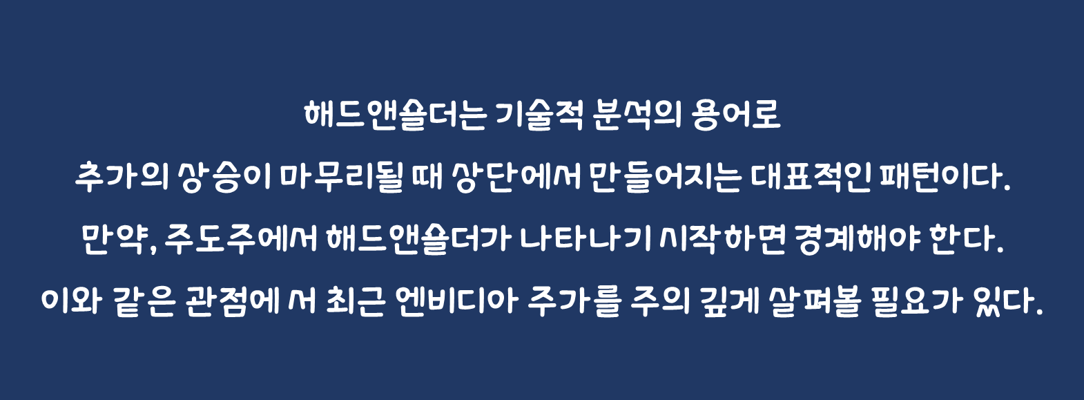 해드앤숄더는 기술적 분석의 용어로 추가의 상승이 마무리될 때 상단에서 만들어지는 대표적인 패턴이다. 만약, 주도주에서 해드앤숄더가 나타나기 시작하면 경계해야 한다. 이와 같은 관점에 서 최근 엔비디아 주가를 주의 깊게 살펴볼 필요가 있다.
