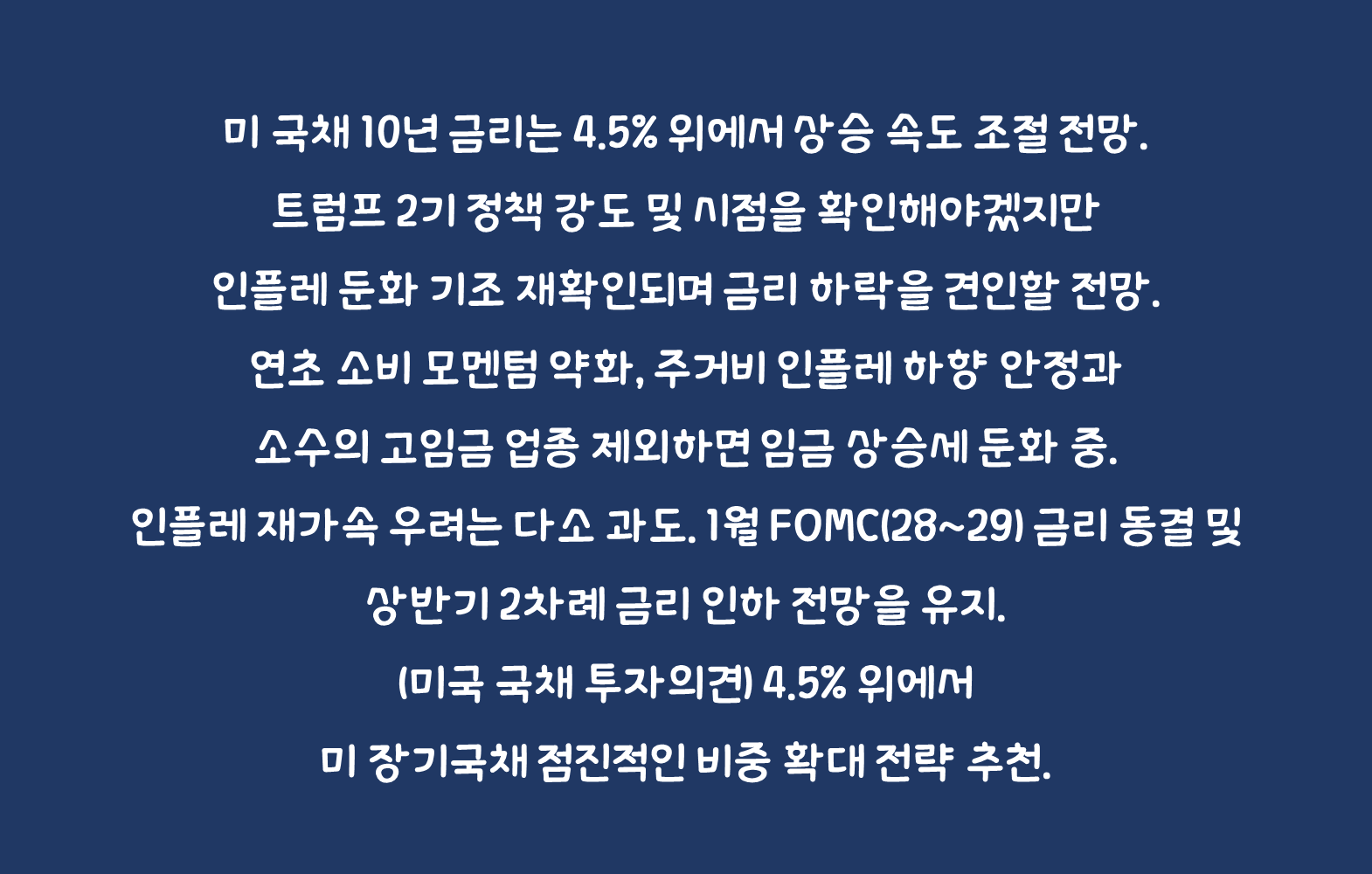 미 국채 10년 금리는 4.5% 위에서 상승 속도 조절 전망. 트럼프 2기 정책 강도 및 시점을 확인해야겠지만 인플레 둔화 기조 재확인되며 금리 하락을 견인할 전망. 관세정책 경계심, 연말 할인판매 등에 가계는 일부 상품 소비를 앞당겨 진행. 연초 소비 모멘텀 약화, 주거비 인플레 하향 안정과 소수의 고임금 업종 제외하면 임금 상승세 둔화 중. 인플레 재가속 우려는 다소 과도. 1월 FOMC(28~29) 금리 동결 및 상반기 2차례 금리 인하 전망을 유지. 채권시장이 연준보다 다소 호키쉬한 금리 인하 경로를 예상하고 있음. 정책 완화 기대 회복되며 금리 상승 압력 완화될 전망.