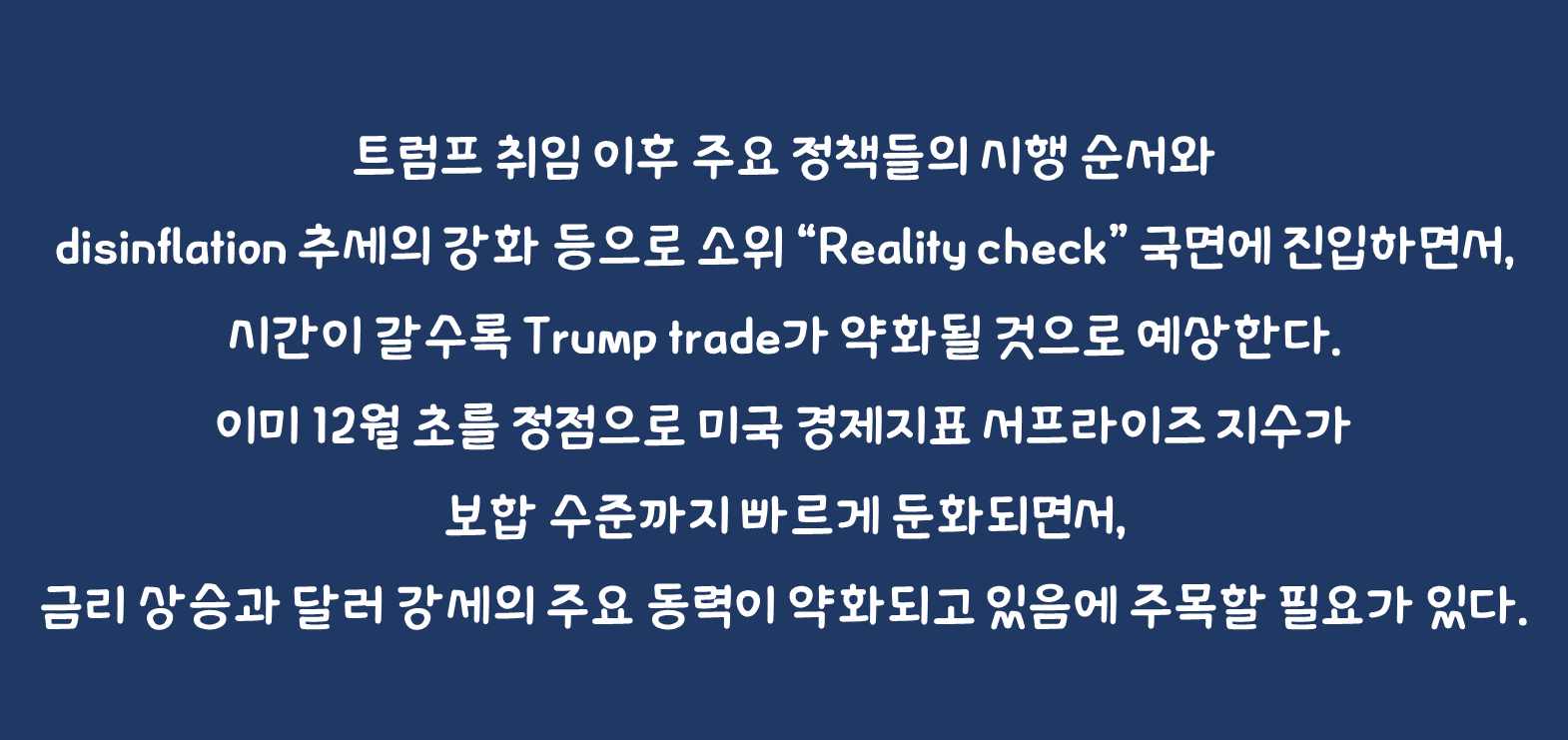 오는 20일 트럼프 취임 이후, 미국 우선주의(MAGA)를 강조하며 對중국 및 자동차 관세 부과에 착수하는 과정에서 장기 금리 상승과 달러 강세 기조가 당분간 이어질 가능성이 높다. 그러나, 당사는 트럼프 취임 이후 주요 정책들의 시행 순서와 disinflation 추세의 강화 등으로 소위 “Reality check” 국면에 진입하면서, 시간이 갈수록 Trump trade가 약화될 것으로 예상한다. 이미 12월 초를 정점으로 미국 경제지표 서프라이즈 지수가 보합 수준까지 빠르게 둔화되면서, 금리 상승과 달러 강세의 주요 동력이 약화되고 있음에 주목할 필요가 있다.