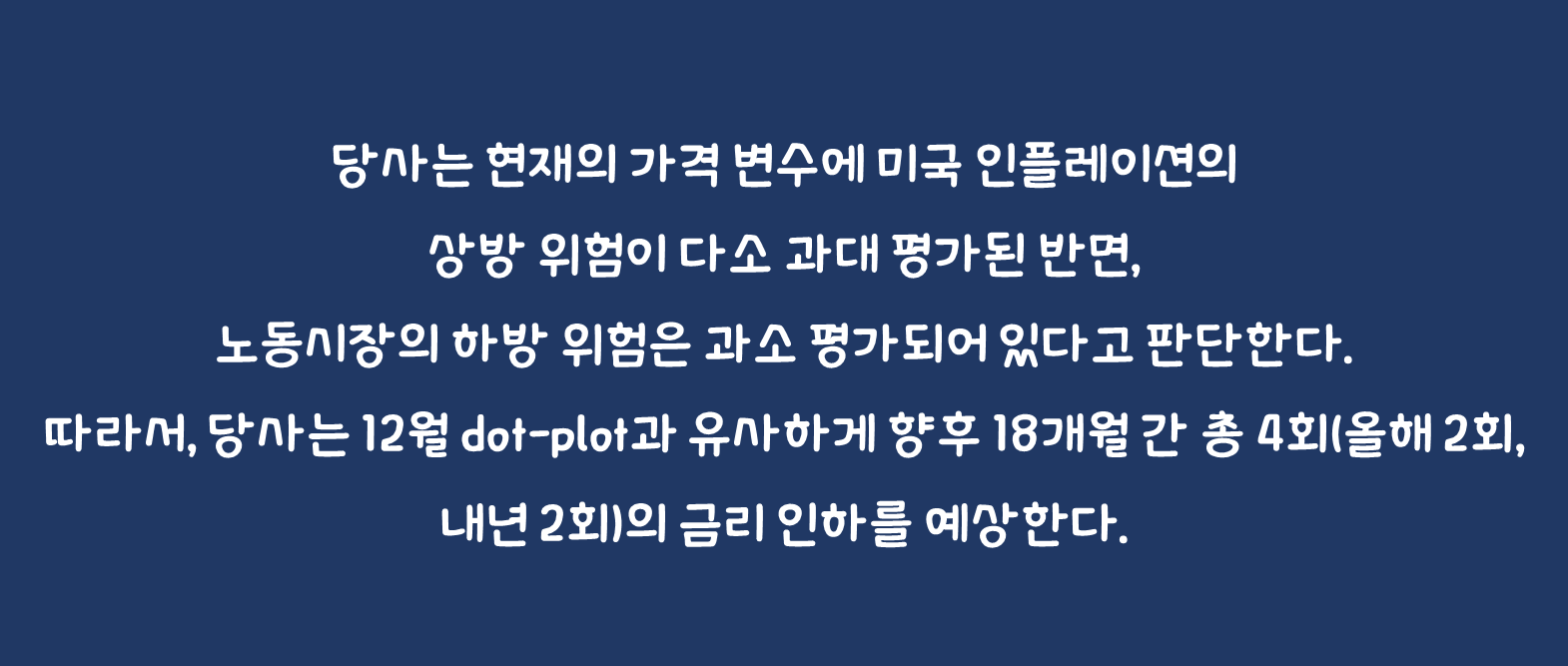 당사는 현재의 가격 변수에 미국 인플레이션의 상방 위험이 다소 과대 평가된 반면, 노동시장의 하방 위험은 과소 평가되어 있다고 판단한다. 먼저 인플레이션의 경우, 11월 물가 지수에서 확인된 것처럼 주거비와 핵심서비스 물가의 둔화 추세가 여전히 지속되고 있다. 지난해 1Q의 계절적/일시적 요인에 따른 물가 상승을 감안 시, 현재 전년 대비 2.4%와 2.8%인 headline과 core PCE물가는 1Q를 거치면서 올 4월 각각 2.1%와 2.2%까지 크게 둔화될 것으로 전망한다. 물론 이후 관세 부과로 올해 말 2.4~2.5%까지 재차 반등이 예상되지만, 이는 일회성이며 ‘26년 상반기 중 물가목표 2%로 복귀할 전망이다. 따라서, 당사는 12월 dot-plot과 유사하게 향후 18개월 간 총 4회(올해 2회, 내년 2회)의 금리 인하를 예상한다.
