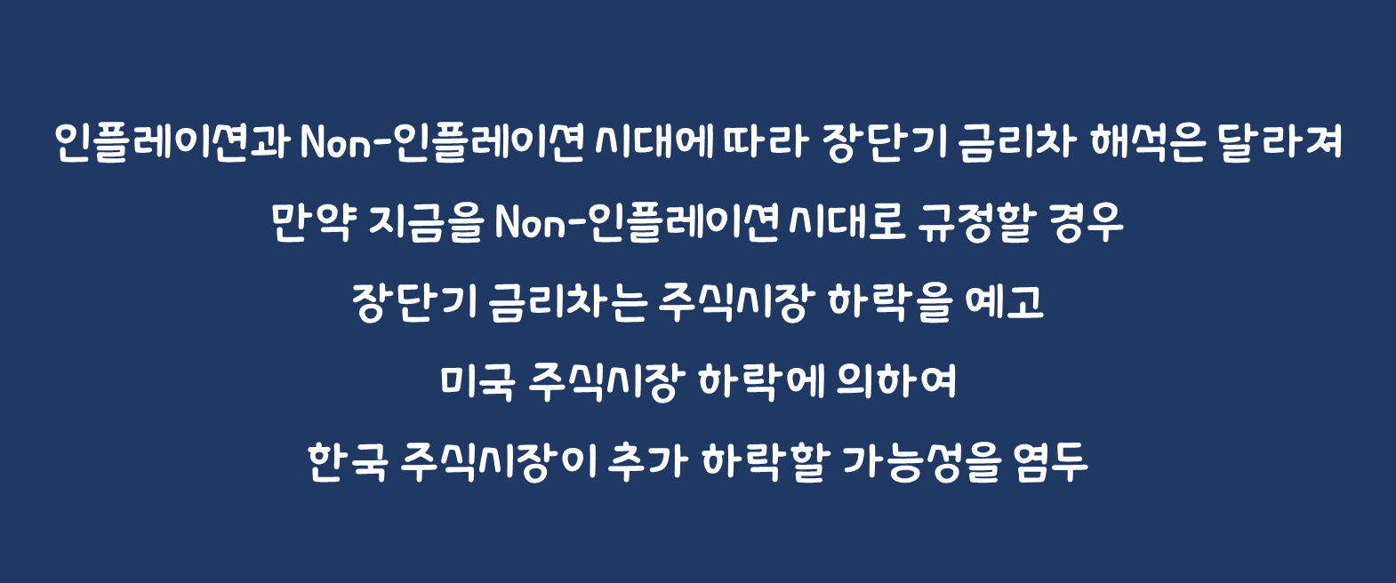 여기서 필자는 후자의 가능성에 조금 더 무게를 두고 있다. 1) 직전인 2021년부터 2022년까지 나타난 인플레이션은 과도한 부양책에 기인했으며 구조적 요인이 아니었다는 점, 2) 현재 물가상 승률은 2% 중반이라는 점, 3) 트럼프 1기 보호무역주의 당시 물가상승률이 되레 하락했다는 점 등이 근거다. 현재 그리고 다가오는 시기가 Non-인플레이션 시대라면 지금 미국의 장단기 금리 차가 보내는 신호를 주의해서 살펴야 한다. 미국 주식시장 하락에 의하여 한국 주식시장이 추가 하락할 가능성을 염두에 둬야 하는 것이다.