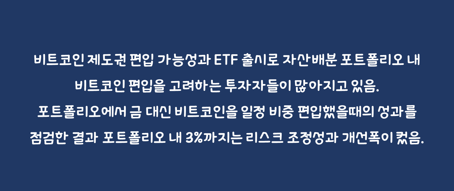 비트코인 제도권 편입 가능성과 ETF 출시로 자산배분 포트폴리오 내 비트코인 편입을 고려하는 투자자들이 많아지고 있음. 비트코인은 2020년 이후 주식과 상관관계 높아졌으나 2013년 이후로 기간을 확장하면 금 대비 주요 자산과 상관관계가 낮음. 주식 50%/채권 40%/리츠 5%/금 5%로 구성된 포트폴리오에서 금 대신 비트코인을 일정 비중 편입했을때의 성과를 점검한 결과 포트폴리오 내 3%까지는 리스크 조정성과 개선폭이 컸음.