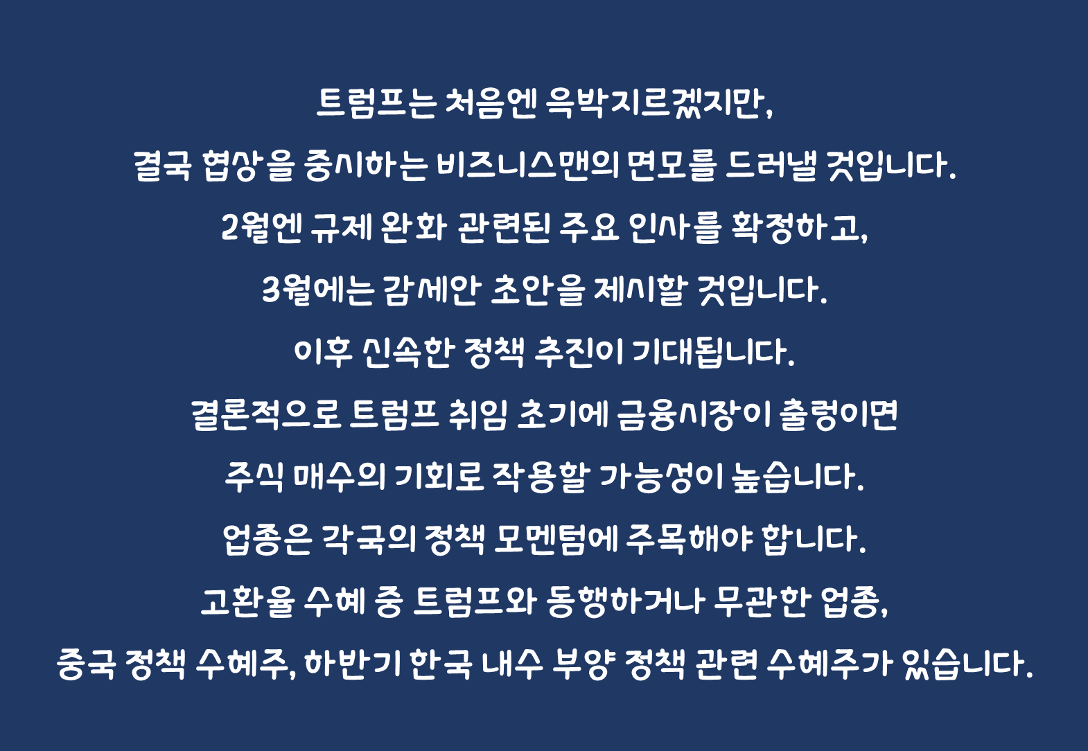 트럼프는 처음엔 윽박지르겠지만, 결국 협상을 중시하는 비즈니스맨의 면모를 드러낼 것입니다. 2월엔 규제 완화 관련된 주요 인사를 확정하고, 3월에는 감세안 초안을 제시할 것입니다. 이후 신속한 정책 추진이 기대됩니다. 결론적으로 트럼프 취임 초기에 금융시장이 출렁이면 주식 매수의 기회로 작용할 가능성이 높습니다.
