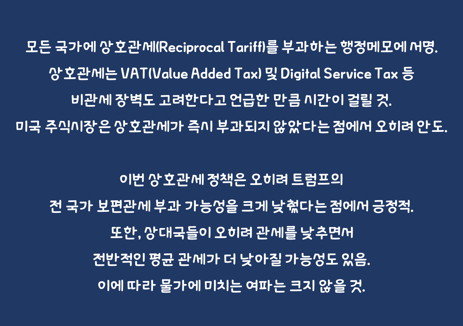 - 팩트: 2월 13일(미국시간) 모든 국가에 상호관세(Reciprocal Tariff)를 부과하는 행정메모에 서명. 이르면 4월 상무부 장관 루트닉, 재무부 장관 베센트, 국토안보부 장관 노엠이 상의 후 부과 예정이라고 발표. 상호관세는 VAT(Value Added Tax) 및 Digital Service Tax 등 비관세 장벽도 고려한다고 언급한 만큼 시간이 걸릴 것. 미국 주식시장은 상호관세가 즉시 부과되지 않았다는 점에서 오히려 안도.