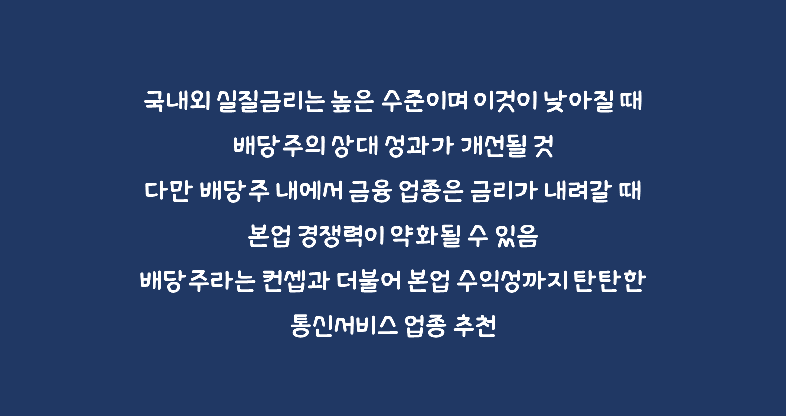 국내외 실질금리는 높은 수준이다. 거시 경제 상황을 볼 때 이것이 변화할 여지가 있다. 이때 타당한 전략은 배당주다. 실질금리가 낮아질 경우 배당주의 상대 성과가 개선된다는 점을 겨냥해야 한다. 그중 가장 매력적인 것은 통신서비스 업종이라고 판단한다.