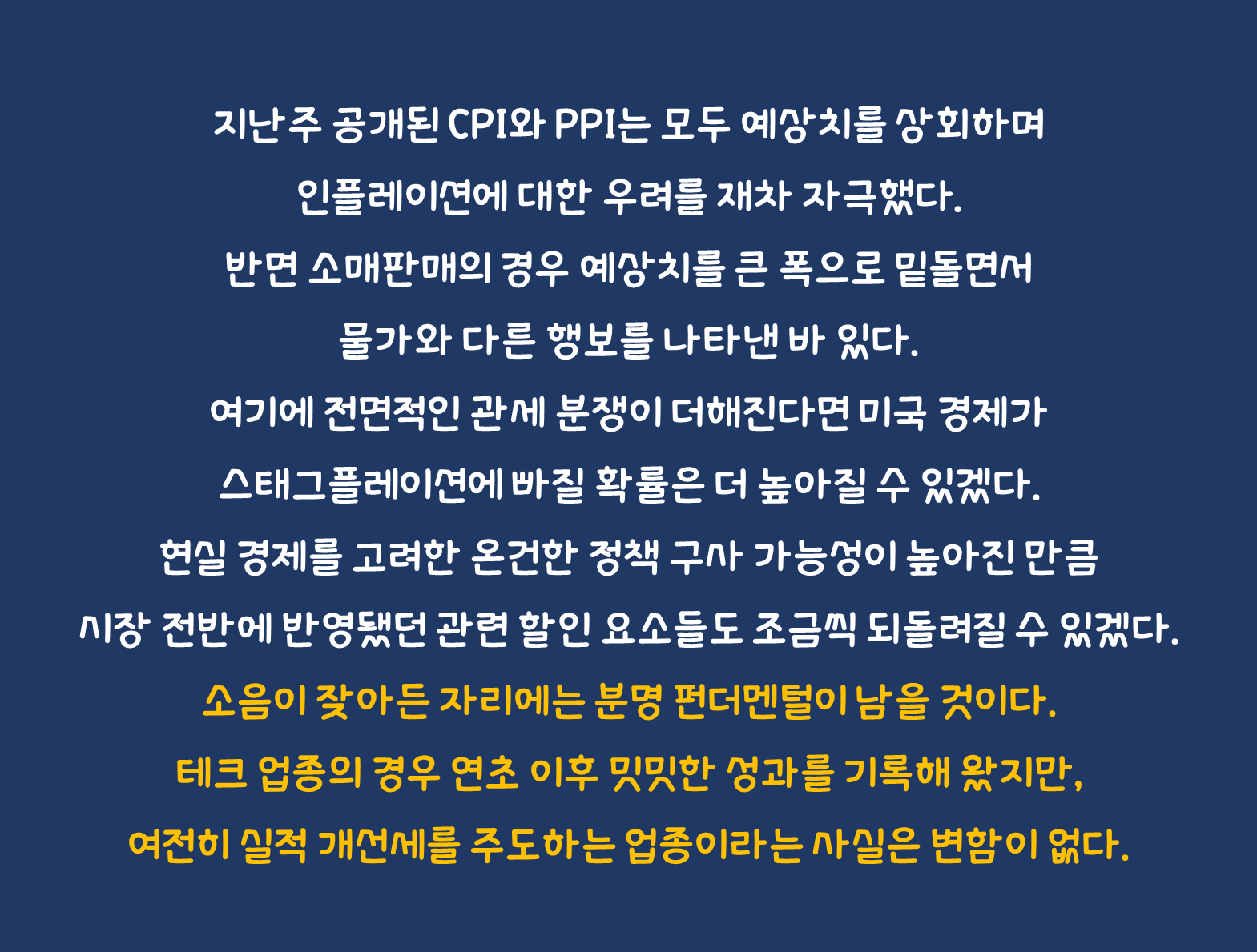 지난주 공개된 CPI와 PPI는 모두 예상치를 상회하며 인플레이션에 대한 우려를 재차 자극했다. 반면 소매판매의 경우 예상치를 큰 폭으로 밑돌면서 물가와 다른 행보를 나타낸 바 있다. 앞서 발표된 미시간대 소비자심리나 NFIB 소기업 낙관 지수 역시 전월 대비 후퇴하는 모습이 연초 이후 부각되는 중이다. 물론 여전히 美 경제는 잠재 성장률을 웃돌고 있으며 중장기 관점에서의 물가 하락 추세는 아직 유효하기에, 간헐적인 부진 신호에 예민하게 반응할 필요는 없다. 그러나 해당 양상들을 조금 과장하여 해석해 본다면, 스태그플레이션 기류가 감지된다고도 말할 수 있을 것이다. 어쨌든 고물가와 경기 둔화 신호가 함께 나타났기 때문이다.