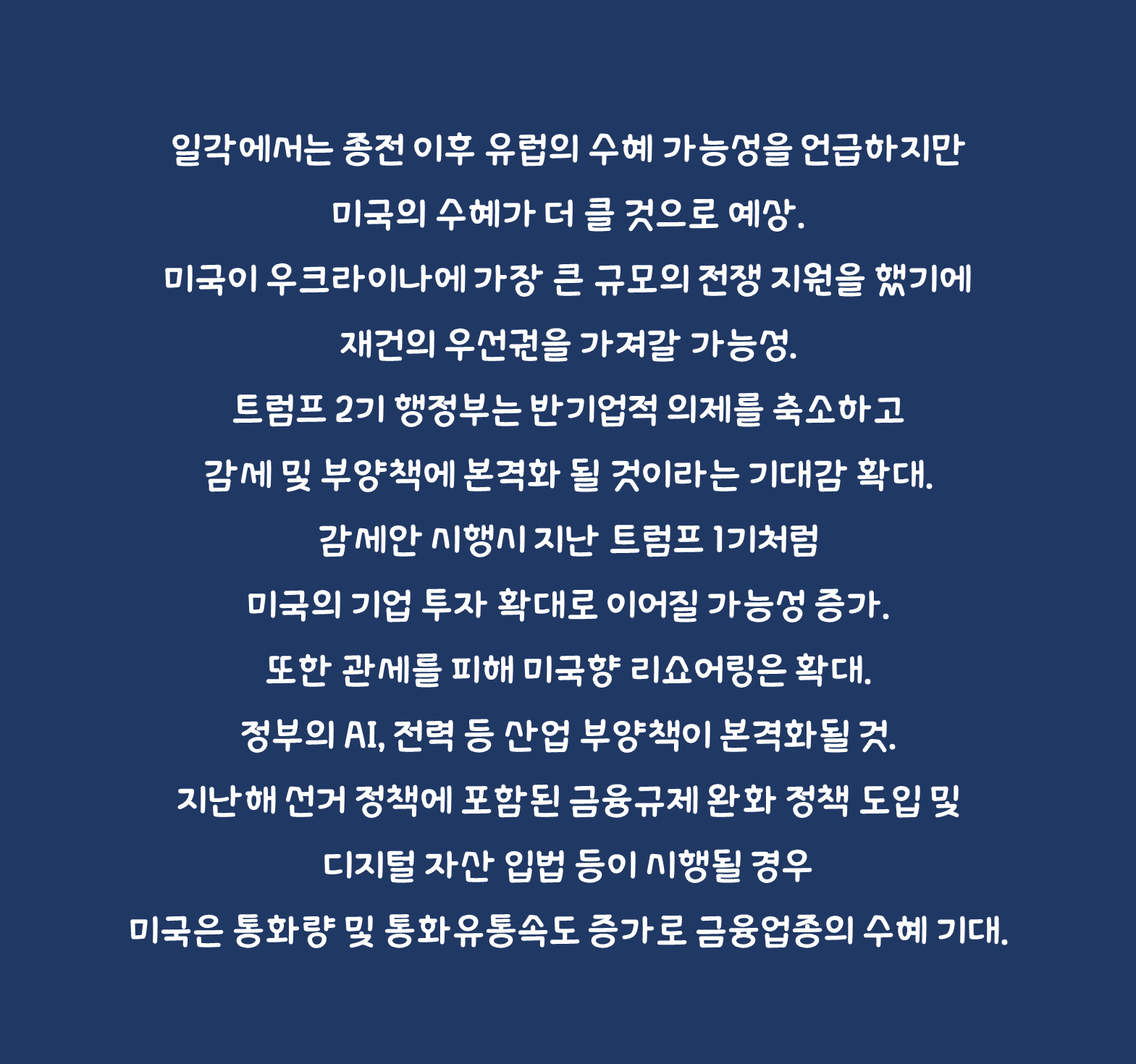 - 트럼프 대통령은 취임 이후 금융규제 기관을 재편하며 규제완화 및 가상화폐에 우호적인 인사들로 지명. 지난해 선거 정책에 포함된 금융규제 완화 정책 도입 및 디지털 자산 입법 등이 시행될 경우 미국은 통화량 및 통화유통속도 증가로 금융업종의 수혜 기대