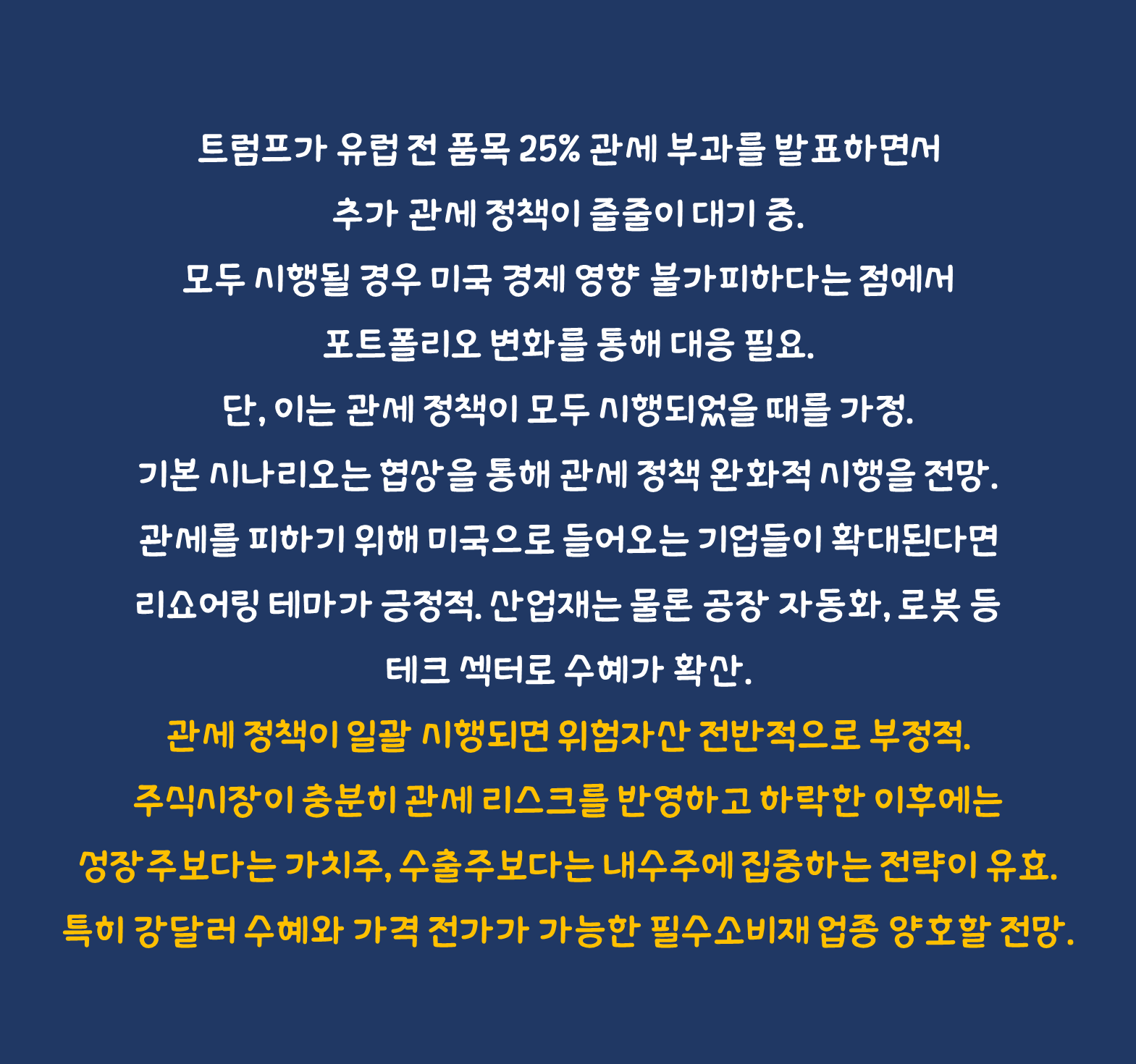 트럼프가 유럽 전 품목 25% 관세 부과를 발표하면서 추가 관세 정책이 줄줄이 대기 중. 모두 시행될 경우 미국 경제 영향 불가피하다는 점에서 포트폴리오 변화를 통해 대응 필요. 단, 이는 관세 정책이 모두 시행되었을 때를 가정. 기본 시나리오는 협상을 통해 관세 정책 완화적 시행을 전망.