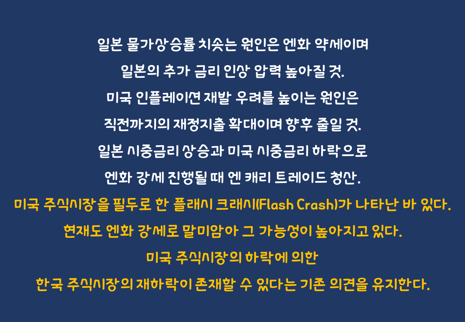 그렇다면 투자자는 단순한 결론을 얻을 수 있다. 일본의 시중금리 오름세와 미국의 시중금리 내림세가 만나며, 엔화 강세가 나타날 수 있다. 이때 글로벌 주식시장은 수급에 마찰이 발생할 수 있다. 엔화 강세에 의한 문제의 대표적인 예는 2024년 8월 주식시장이다. 당시 엔화 강세로 엔 캐리 트레이드 청산이 이뤄지며 미국 주식시장을 필두로 한 플래시 크래시(Flash Crash)가 나타난 바 있다. 현재도 엔화 강세로 말미암아 그 가능성이 높아지고 있다. 당연한 말이지만 이상 언급한 내용이 한국 주식시장에도 주가 하락 압력 요인으로 작용한다. 미국 주식시장의 하락에 의한 한국 주식시장의 재하락이 존재할 수 있다는 기존 의견을 유지한다.