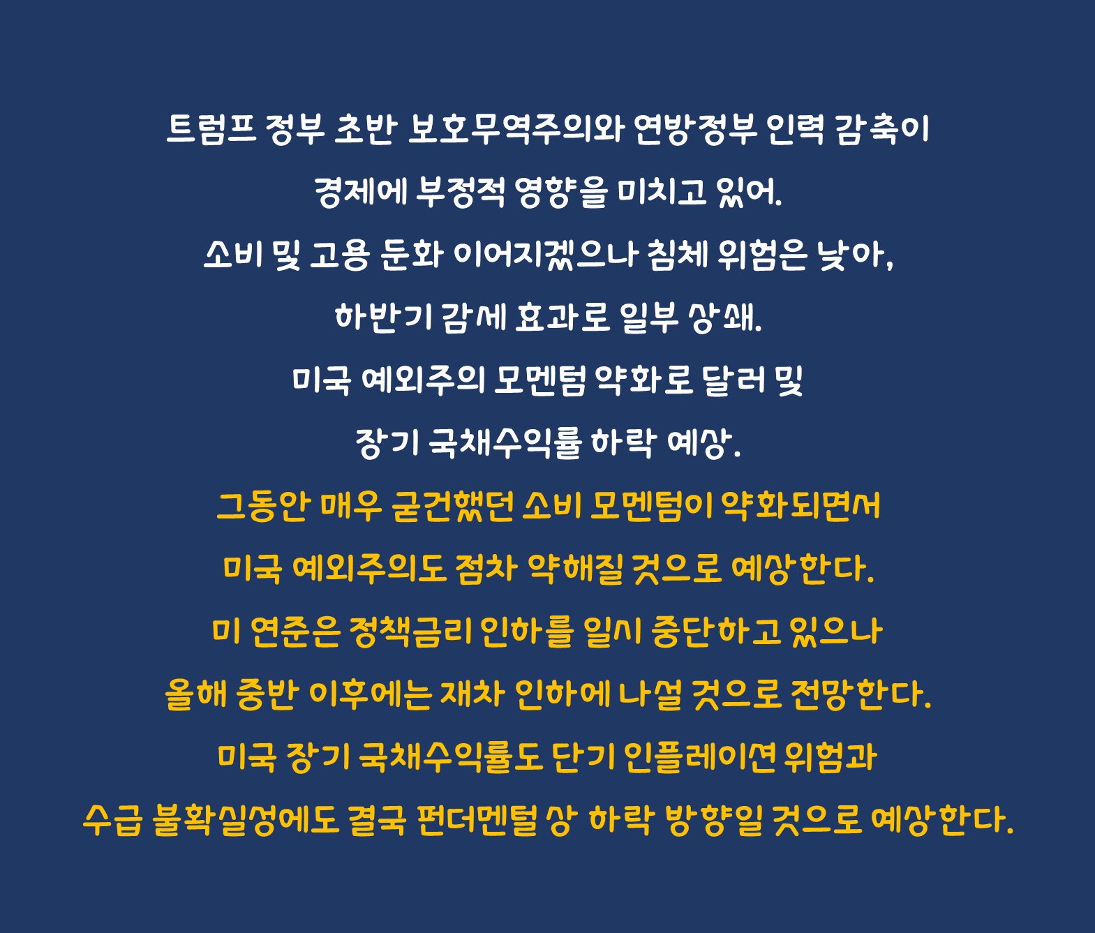 미국 예외주의 모멘텀 약화로 달러 및 장기 국채수익률 하락 예상: 그동안 매우 굳건했던 소비 모멘텀이 약화되면서 미국 예외주의도 점차 약해질 것으로 예상한다. 미 연준은 정책금리 인하를 일시 중단하고 있으나 올해 중반 이후에는 재차 인하에 나설 것으로 전망한다. 달러 가치는 관세 등 정책 불확실성이 커질 때마다 지지받을 수 있으나 보다 긴 호흡에서는 미국 소비 성장 둔화와 연준의 금리 인하 기대감에 약세 가능성이 크다고 판단된다. 미국 장기 국채수익률도 단기 인플레이션 위험과 수급 불확실성에도 결국 펀더멘털 상 하락 방향일 것으로 예상한다.