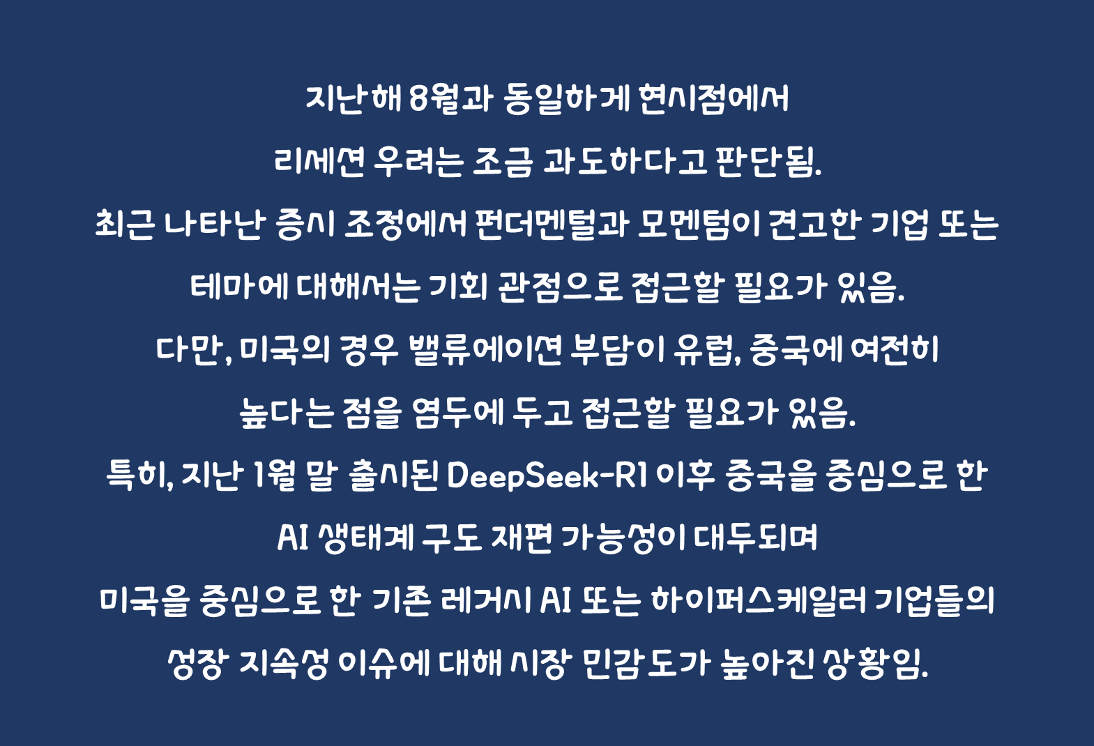 지난해 8월과 동일하게 현시점에서 리세션 우려는 조금 과도하다고 판단됨. 최근 나타난 증시 조정에서 펀더멘털과 모멘텀이 견고한 기업 또는 테마에 대해서는 기회 관점으로 접근할 필요가 있음. 다만, 미국의 경우 밸류에이션 부담이 유럽, 중국에 여전히 높다는 점을 염두에 두고 접근할 필요가 있음. 특히, 지난 1월 말 출시된 DeepSeek-R1 이후 중국을 중심으로 한 AI 생태계 구도 재편 가능성이 대두되며 미국을 중심으로 한 기존 레거시 AI 또는 하이퍼스케일러 기업들의 성장 지속성 이슈에 대해 시장 민감도가 높아진 상황임.