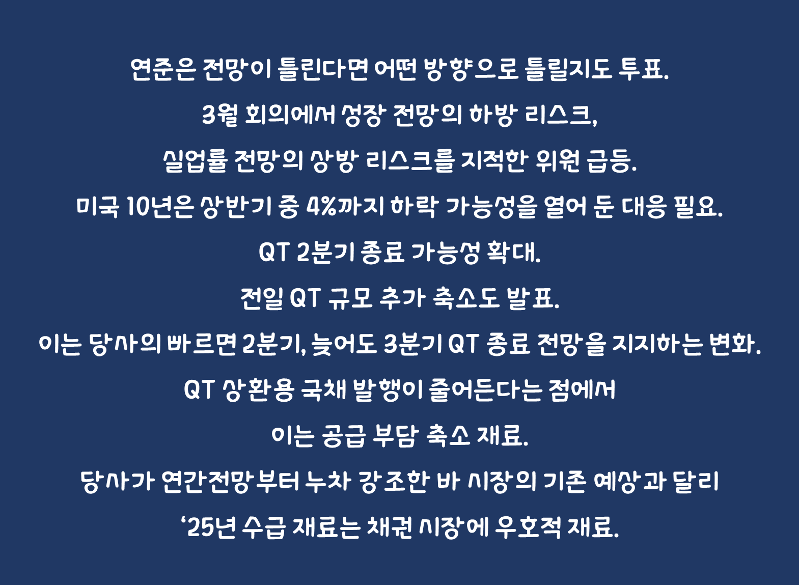 전일 QT 규모 추가 축소도 발표. 이는 당사의 빠르면 2분기, 늦어도 3분기 QT 종료 전망을 지지하는 변화. QT 상환용 국채 발행이 줄어든다는 점에서 이는 공급 부담 축소 재료. 이에 더해 당사는 최근 보우먼 이사가 금융감독 부의장으로 지명되며 금융 규제 완화가 빨라질 것으로 전망. 특히, 보우먼 이사가 연초 이후 지속적으로 은행의 국채 시장 참여를 확대하는 금융 규제 완화를 강조했음을 감안하면 베센트가 언급 한 ESLR 규제 완화가 빨라질 것. 당사가 연간전망부터 누차 강조한 바 시장의 기존 예상과 달리 ‘25년 수급 재료는 채권 시장에 우호적 재료.