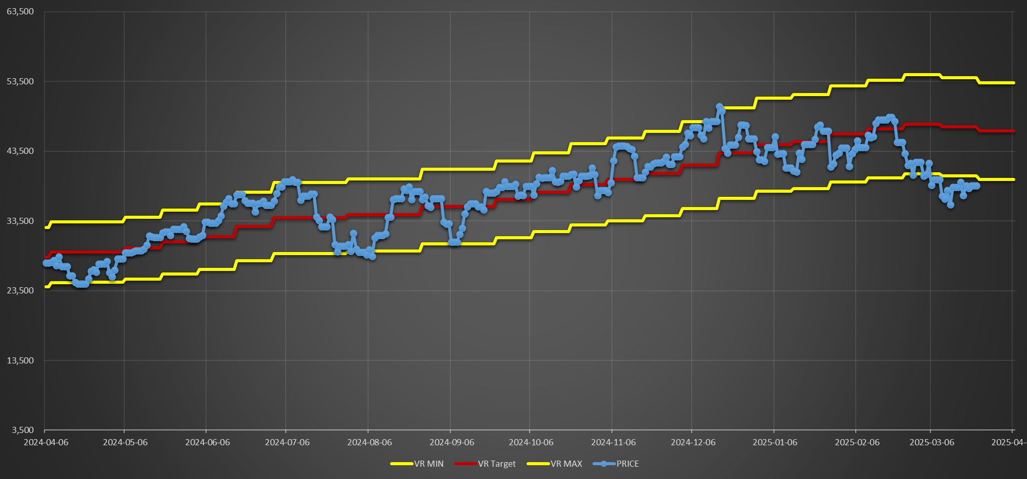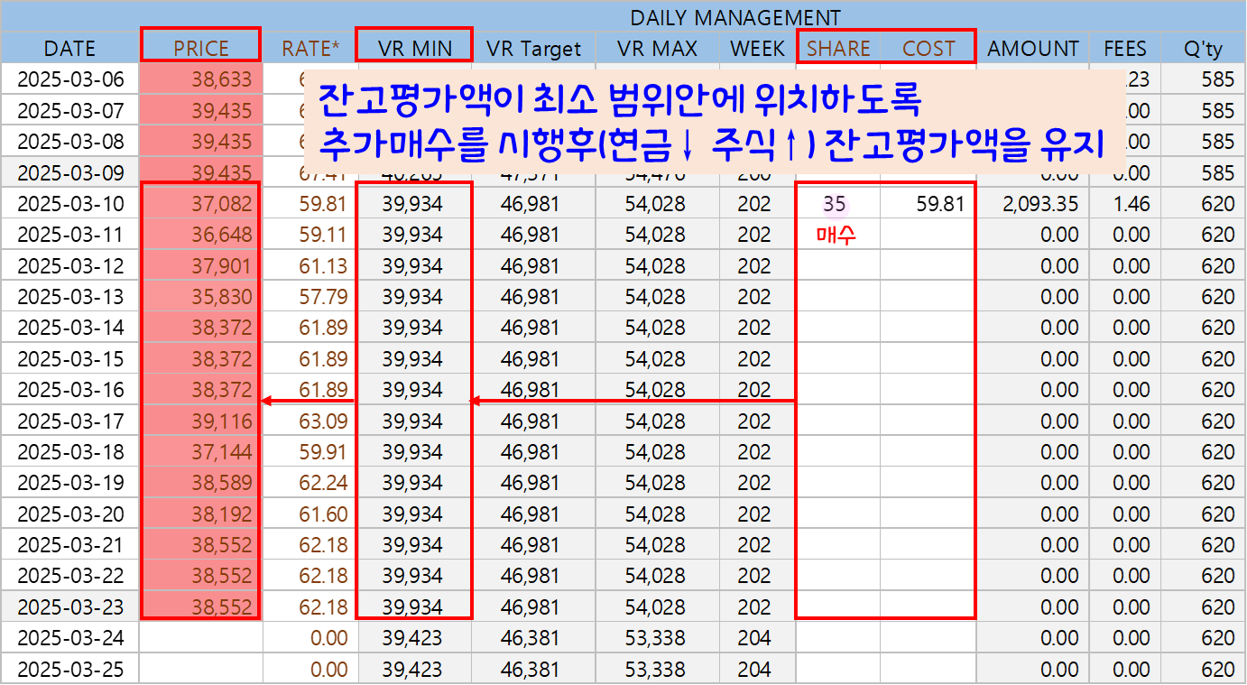트럼프발 관세 우려로 하락장이 본격 시작 되었습니다. 지난 회차에 이어 다시 VR 매수하단에 닿아 가진 현금 40%를 사용하여 추매가 있었습니다. 앞으로도 현금이 남아 있는 한 계속 매수가 발생하여 현금이 빠르게 줄어들 수 있습니다. 두려운 상황이지만 계획대로 진행해 보겠습니다.