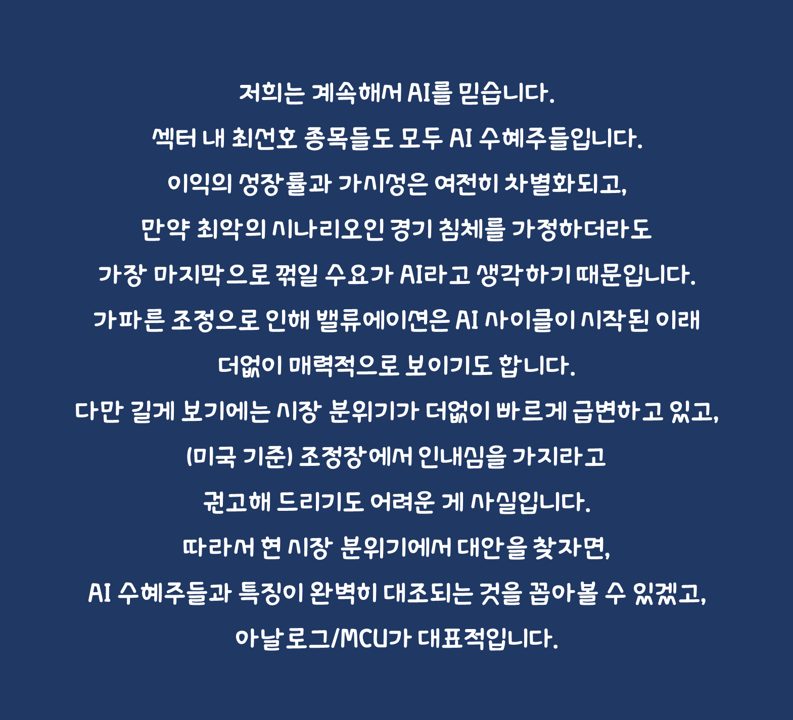 저희는 계속해서 AI를 믿습니다. 섹터 내 최선호 종목들도 모두 AI 수혜주들입니다. 이익의 성장률과 가시성은 여전히 차별화되고, 만약 최악의 시나리오인 경기 침체를 가정하더라도 가장 마지막으로 꺾일 수요가 AI라고 생각하기 때문입니다. 가파른 조정으로 인해 밸류에이션은 AI 사이클이 시작된 이래 더없이 매력적으로 보이기도 합니다.