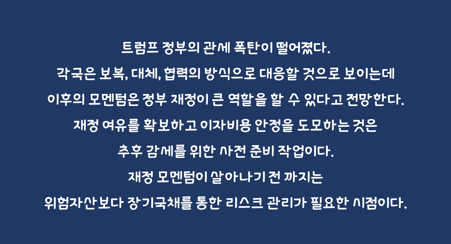 트럼프 정부의 관세 폭탄이 떨어졌다. 각국은 보복, 대체, 협력의 방식으로 대응할 것으로 보이는데 이후의 모멘텀은 정부 재정이 큰 역할을 할 수 있다고 전망한다. 트럼프 2기 초반 정책은 관세, 정부 지출 구조조정, 방위비 분담 요구 등이다. 1기 때와 달리 감세와 규제 완화 같은 성장 우호적 정책을 뒤로하고 성장에 부담을 주는 정책을 우선순위로 삼은 배경은 정부부채 지속 가능성 확보를 위해서다. 재정 여유를 확보하고 이자비용 안정을 도모하는 것은 추후 감세를 위한 사전 준비 작업이다. 공화당은 상반기 중 올해 만료 예정인 TCJA 연장과 부채한도 문제를 해결하고자 한다. 공화당이 의회를 장악하고 있음에도 정부 예산이 타이트한 상황을 감안할 때 신속한 의회 통과 여부는 불투명하다. 즉 현재 미국은 재정 모멘텀 공백 및 높은 정책 불확실성 구간이다. 재정 모멘텀이 살아나기 전 까지는 위험자산보다 장기국채를 통한 리스크 관리가 필요한 시점이다.