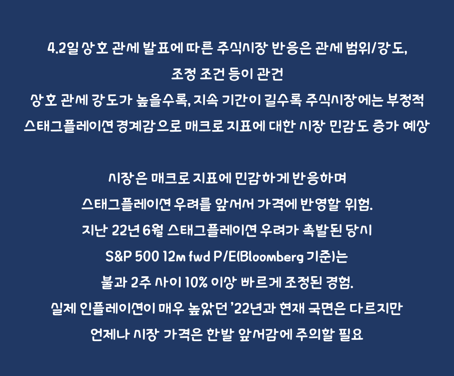 시장은 매크로 지표에 민감하게 반응하며 스태그플레이션 우려를 앞서서 가격에 반영할 위험. ’지난 22년 6월 스태그플레이션 우려가 촉발된 당시 S&P 500 12m fwd P/E(Bloomberg 기준)는 불과 2주 사이 10% 이상 빠르게 조정된 경험. 실제 인플레이션이 매우 높았던 ’22년과 현재 국면은 다르지만 언제나 시장 가격은 한발 앞서감에 주의할 필요