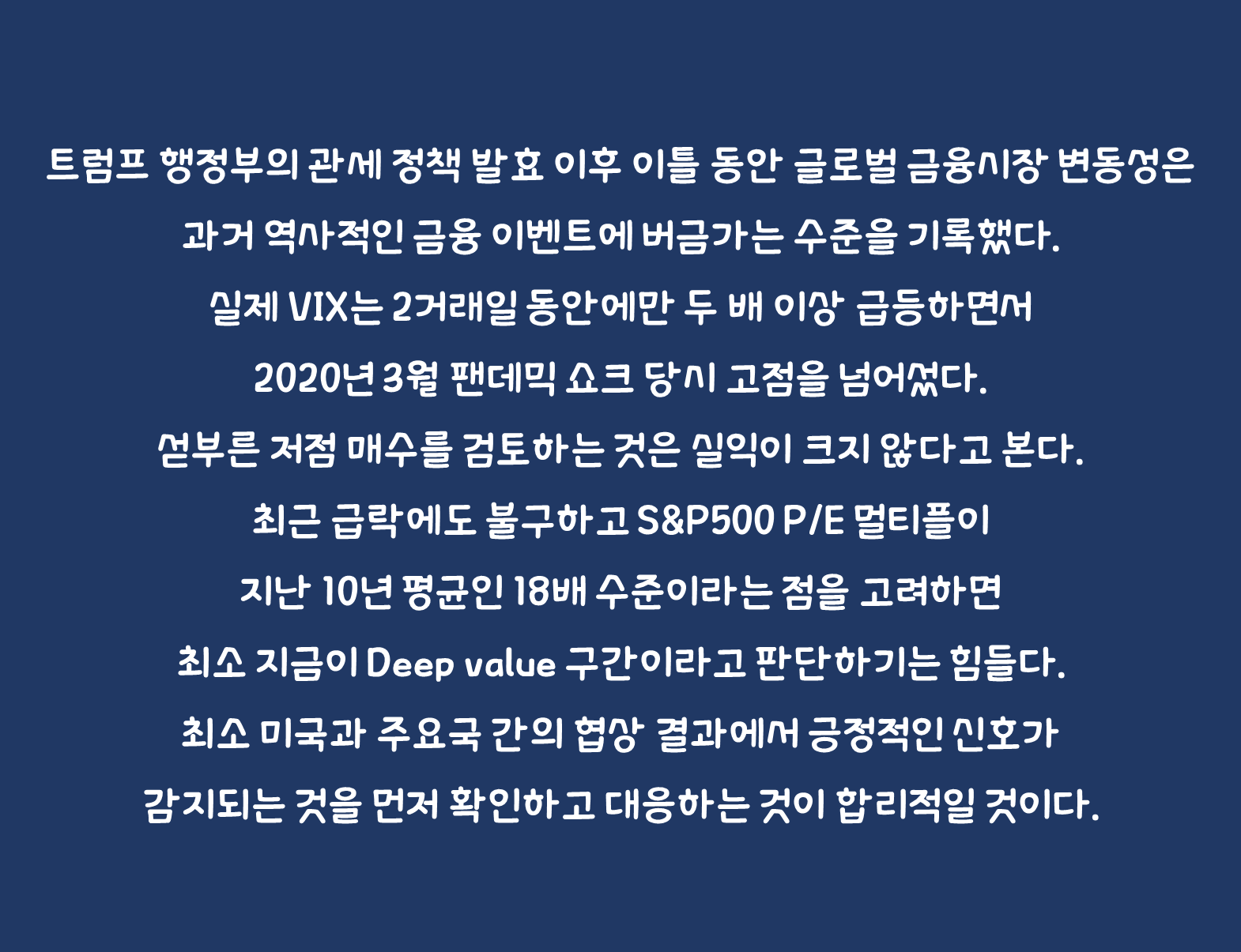 트럼프 행정부의 관세 정책 발효 이후 이틀 동안 글로벌 금융시장 변동성은 과거 역사적인 금융 이벤트에 버금가는 수준을 기록했다. 실제 VIX는 2거래일 동안에만 두 배 이상 급등하면서 2020년 3월 팬데믹 쇼크 당시 고점을 넘어섰다. 당연히 S&P500 지수도 급격한 조정 여파로 인해 현재 기술적 지표상 과매도 구간에 위치해 있다. 아주 오랜만에 패닉 셀링 신호가 확인된 만큼, 혹자는 저점 매수 타이밍을 생각해 볼 수도 있겠다. 실제 기념비적인 수익률은 시장에 만연한 공포를 극복하는 과정에서 나타나는 경우가 많기도 하다. 그러나 위험-보상 관점에서 접근한다면 아직은 신중함을 우선하는 것이 나을 것이다. 이유는 다음과 같다.
