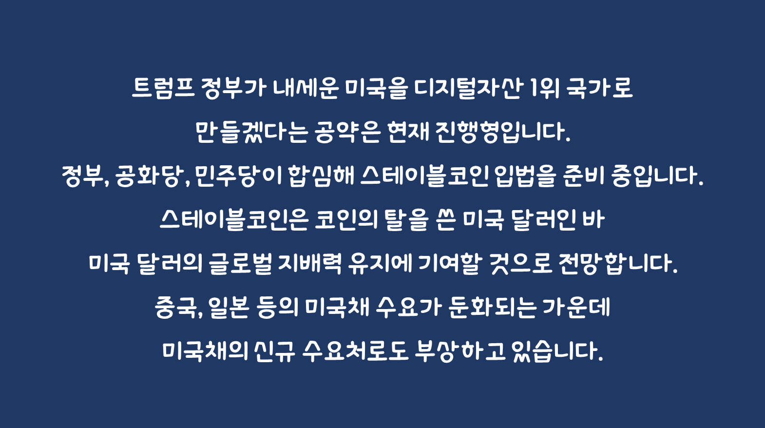 트럼프 정부가 내세운 미국을 디지털자산 1위 국가로 만들겠다는 공약은 현재 진행형입니다. 정부, 공화당, 민주당이 합심해 스테이블코인 입법을 준비 중입니다. 스테이블코인은 코인의 탈을 쓴 미국 달러인 바 미국 달러의 글로벌 지배력 유지에 기여할 것으로 전망합니다. 중국, 일본 등의 미국채 수요가 둔화되는 가운데 미국채의 신규 수요처로도 부상하고 있습니다. 스테이블코인이 산업에 어떤 영향을 미칠지, 한국에는 어떤 함의를 갖는지도 살펴보았습니다.