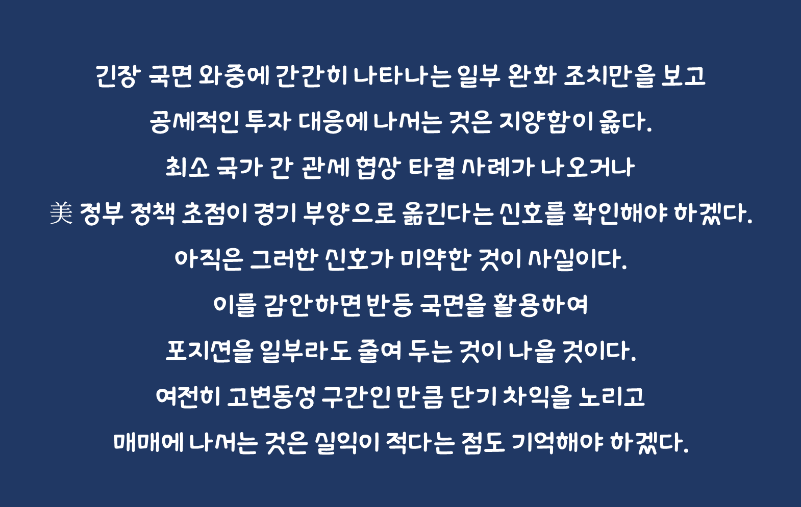 따라서 긴장 국면 와중에 간간히 나타나는 일부 완화 조치만을 보고 공세적인 투자 대응에 나서는 것은 지양함이 옳다. 최소 국가 간 관세 협상 타결 사례가 나오거나 美 정부 정책 초점이 경기 부양으로 옮긴다는 신호를 확인해야 하겠다. 무엇보다도 트럼프 정부의 커뮤니케이션이 일관되고 시장 반응에 교감하는 행태가 나타날 필요가 있다. 아직은 그러한 신호가 미약한 것이 사실이다. 이를 감안하면 반등 국면을 활용하여 포지션을 일부라도 줄여 두는 것이 나을 것이다. 여전히 고변동성 구간인 만큼 단기 차익을 노리고 매매에 나서는 것은 실익이 적다는 점도 기억해야 하겠다.