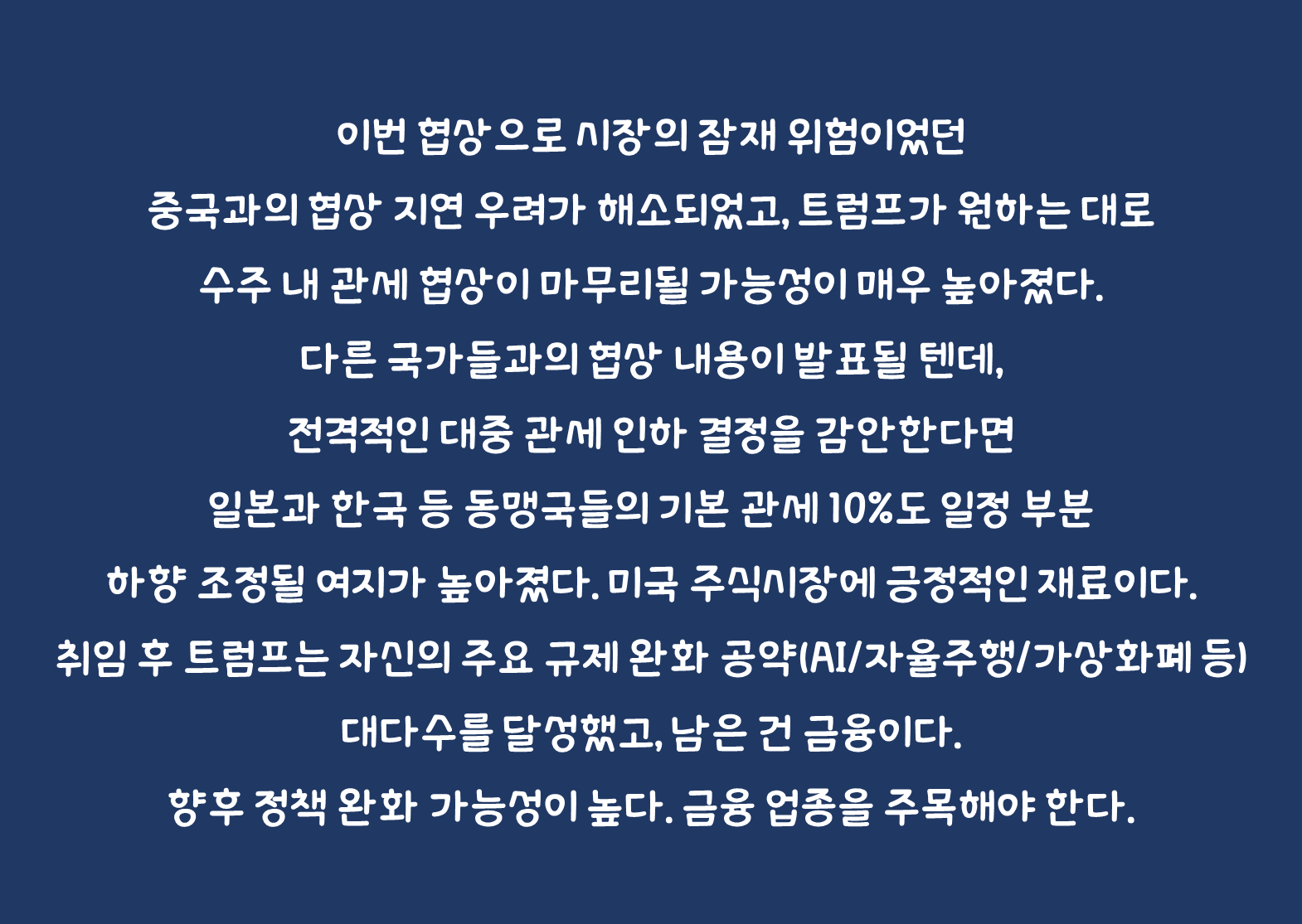 ✅ 전격적인 대중 관세 인하 조치 고려할 때, 수주 내 발표될 주요국 협상에서 기본 관세 인하 또한 기대 가능